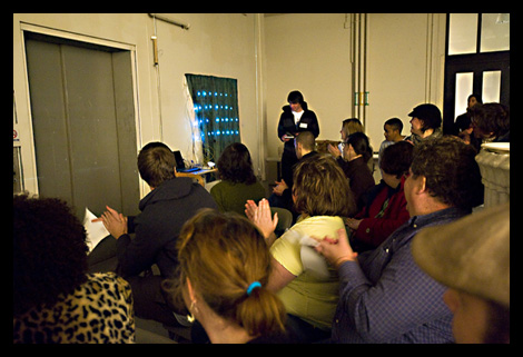 Audio Interplay was a project originated by Garrett Lee, a sophomore studying interdisciplinary sculpture and graphic design at MICA. The creation is a sound-activated LED tapestry. The tapestry reacts with sound and light depending on the users location within a space. The interactive nature of the tapestry incited a rousing round of applause once the audience realized that they could interact with the exhibit from where they stood.