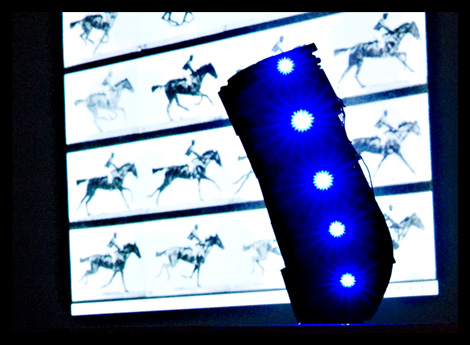 The LED Gallup Boot was developed by Emily Cudworth, a junior at MICA. The boot is fitted to the lower leg of a horse where it lights up when the horse’s hoof hits the ground and switches off once it’s lifted. There are both artistic and practical applications for the LED Gallup Boot such as using the points generated by the LEDs to analyze the horse’s stride or possibly having a rider and horse both wearing LEDs for the sake of accentuating a riding performance.