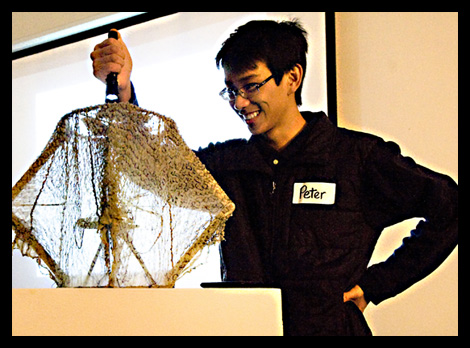 Breath of Life was a conceptual piece and the result of a collaboration between Peter Bai, an environmental engineering major from Johns Hopkins, and Samara Rosen, a fiber major from MICA. The concept was to use solar panels to power a device that emulates the act of breathing. The device is also light sensitive which Peter Bai demonstrated with a flashlight. When light reaches the sensors the device expands and contracts as if it were inhaling and exhaling.