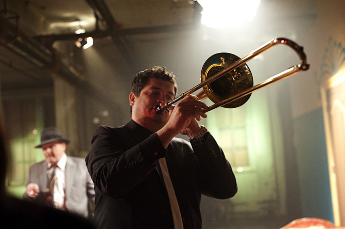 Bosley with  trombone player, Micah De La Huerta of The Bellevederes, Tiffany DeFoe and  Sean Beier on tuba also from The Bellevederes.