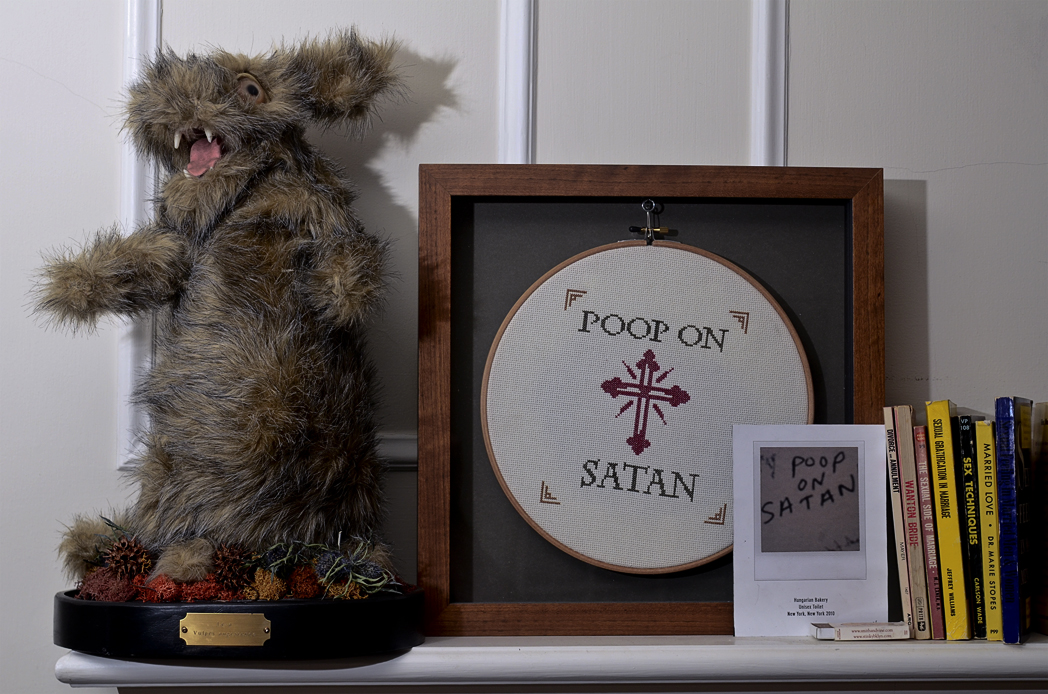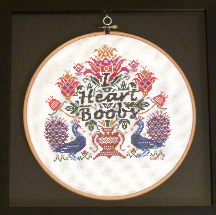 A consummate creator, Marbury soon took the sewing skills he developed while working on his Urban Beasts, and started working on new projects. While still in Minessota, he partnered  with a fellow artist named Jes Schrom, on a project devoted to documenting bathroom graffiti in cross stitch. He and Schrom would find graffiti on bathroom walls, capture the text, and then create a cross-stitch design re-imagining the text through one of the oldest forms of embroidery. Instead of the usual “Home is Where the Heart Is”, Marbury’s cross-stitch presents such slogans as “I Heart Boobs” and “Poop, I say Poop.”