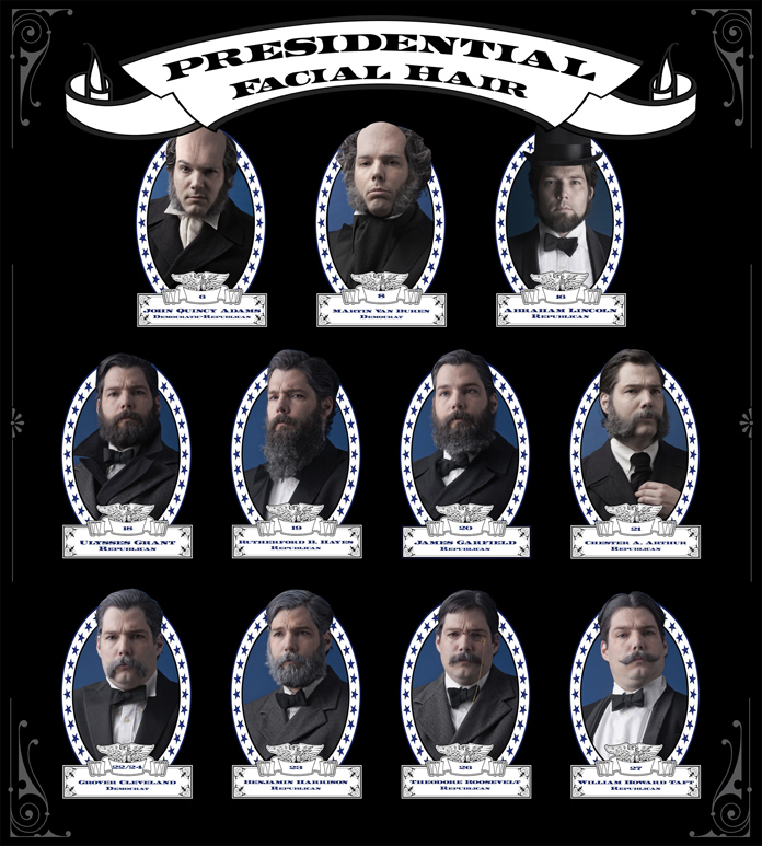When I arrived at Robert’s home for a hilarious and insightful conversation, one of the first things I encountered was his wall of commemorative plates, all featuring himself. Well, kind of. This project, one of his many, was completed over a six month period. He planned, grew, and shaved his hair in the likeness of various presidents of the United States. The portraits he then took comprised first a set of trading cards, and later the commemorative plates which now greet me upon my arrival.
