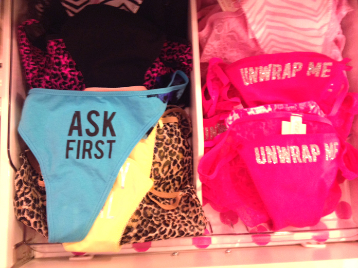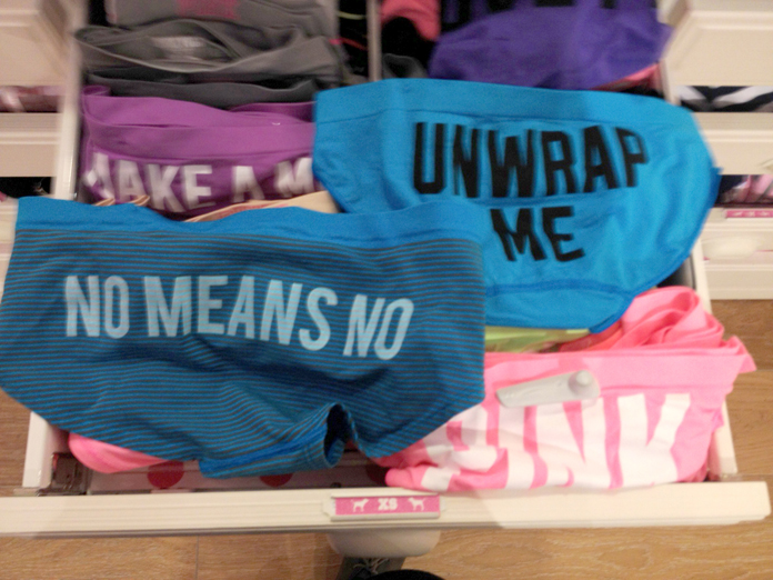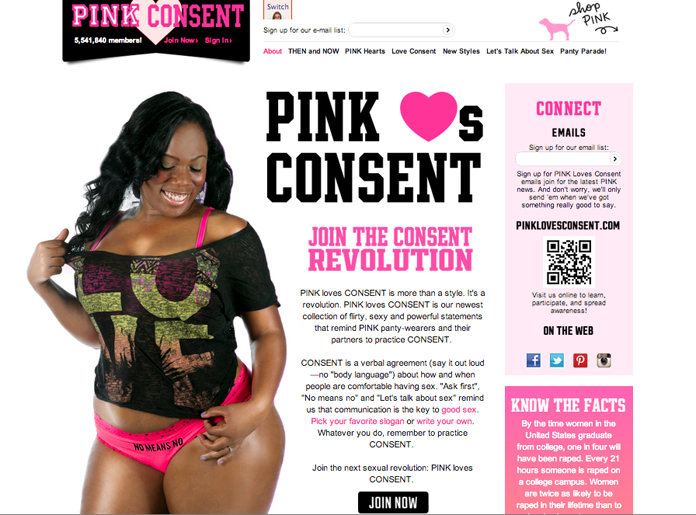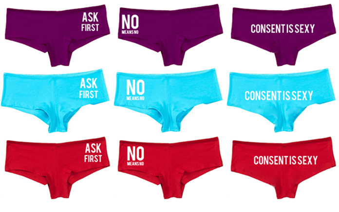 Consent is a verbal agreement about how and when people are comfortable having sex. The fake site sports panties reading consent slogans, such as “Ask First” or “No means No.” On the “Then and Now” page, the parody says “Then we loves styles that were all about rape culture. Now we love styles that are all about consent. Catch changes hitting stores this holiday season!”