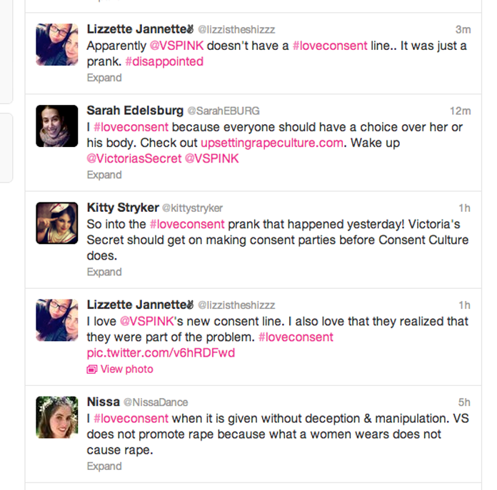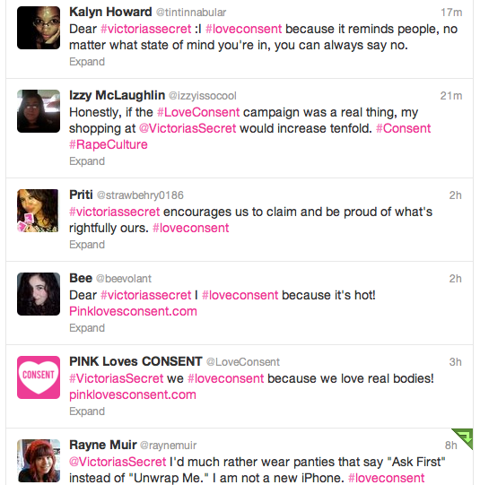 The panty prank got an overwhelmingly positive response. In two days, this site had over 200,000 hits. The stunt was written up in the Huffington Post, Jezebel, The Daily Beast, New York Daily News, New York Magazine and BUST to name a few. EVERYONE was talking about it on social media. High school and college aged students blogged and reblogged the story like crazy. International consent enthusiasts tweeted positive declarations about why they #loveconsent. And during the broadcast of the annual Fashion Show the #victoriassecret hashtag was successfully hi-jacked to promote #loveconsent more than the #vsfashionshow.