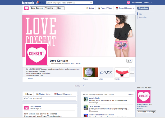 A few bloggers are speculating whether, in fact, Victoria’s Secret that is behind PINK Loves Consent. After all, how could a couple of feminists do a project like this with no money and no corporate support? With all volunteers? And a budget of a few hundred dollars?