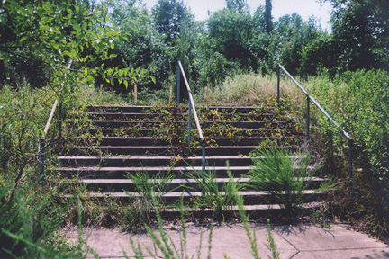 We take a side road laced overhead with crazy vines clinging to powerless power lines. The rotting pavement leads us into a forest with tree trunks the diameter of human limbs. There’s some kind of structure interwoven with the trees: terraced, horizontal boards in a vast grid—bleachers—bleachers 70 rows deep, with aisles and sections. Seating for thousands. They go on and on through the forest, encircling an arena of jungle. Ghost spectators watching a ghost contest. We walk on. What’s under our feet is never quite earth—even in the woods it feels like concrete is just under the surface. We’re about to cross the ghost highway when we hear a roar. A semi truck appears. WHAT? We hide in the bushes, not sure if we’ve been spotted. My guide doesn’t want to get caught.