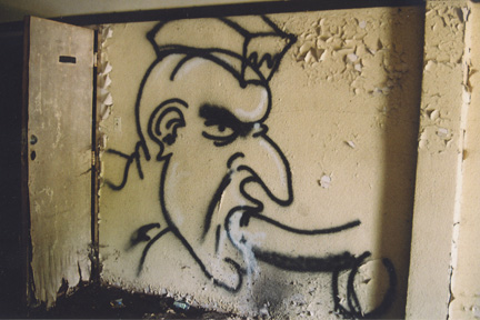 On another wall, a nicely rendered cartoon of a man boiling in a giant pot, with the slogan: Keep Out of Hot Water. Also, some spray-paint porno. Walking on, we come to realize that some of the structures are like palimpsests over older, skeletal structures. A brick chimney rises fifty feet above a rubble-strewn courtyard the size of a football field. We find a square hole—an abrupt drop-off into a cavernous underground system. Scary.