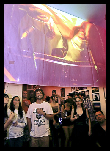 Above is a live projection of Matt Muirhead‘s Participatory Puppet Theatre while below we can see the audience at Gallery 788 enjoying Matt and Karolyn Seidl’s acapella-chin-puppet-band ‘Seeing Bunnies’. Instant Gratification was their world premier and a hit a that. You probably can tell much of it was over our heads. Photo and caption by Philip Laubner. |
