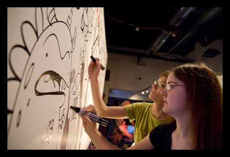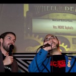 MCs and comic artists Marty Day and Ross Nover are like the human versions of Mystery Science Theater 3000 robots, totally hilarious, and both are among the five original creators of Super Art Fight. Here the duo stands below the spinning ‘Wheel of Death.’ Contestants pull a lever and the wheel spits out a topic that is then improvised in illustration, topics like robots, tophats, or Mystery Science 3000.