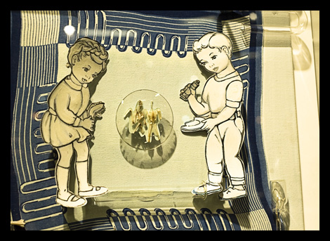 Jane Gennaro’s (New York City) “Fixing Things is Sometimes Easy” was particularly intriguing because of the incredible array of mixed media. Inside this piece you’ll find an antique handkerchief, coloring book illustrations and animal bones. We’re guessing they’re bird skeletons, but perhaps you should see for yourself. It’s nostalgia on speed; history torn apart and put back together with a melancholy awareness of things lost but not forgotten. It reminds me that death, too, can be elegant.
