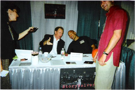 “Written By,” the official magazine of the Writers Guild of America, certainly has the cred to put out a magazine. Others, like Creative Screenwriting, are into the picks and shovels business. Creative Screenwriting Magazine produces the Screenwriting Expo (screenwritingexpo.com), an annual convention/ trade show. Expo 2010 is coming up October 7-10. The Screenwriting Expo is a for-profit event packed with vendors selling their wares, seminars, classes and panels, guest speakers, screenplay contests, and a story pitch fest (the “Golden Pitch Event”). The attendees are folks decidedly outside of “the business.” I attended Expo ‘09 as an exhibitor, hawking my story consulting service (storysolver.com). I was accompanied by my radiant assistant, Roma Perrier, and my enforcer, Joe Basile.