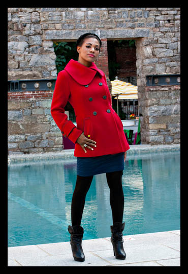 Crystal wearing Soia & Kyo Red Coat and Tracy Reese Blue Mini Skirt.