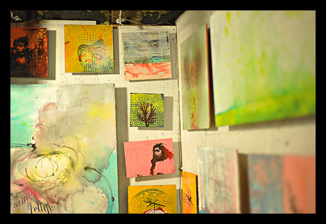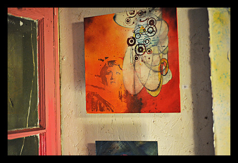 The Avenue in Hampden had the good fortune of one of the most prolific young artists in the city opening his new gallery there recently. The vibrant cultural fusion that makes 36th Street one of the most engaging destinations in the city just got a little more colorful thanks to Matt Muirhead. Muirhead‘s new gallery Headspace hosts a varied collection of mixed media paintings that covers a wide swath of subject matter and whose execution is a testament to the artist’s inventiveness. It would literally take hours to explore the pieces in the basement gallery and the larger ones hosted upstairs at Metta Integrative Wellness Center. Currently the works displayed at Headspace are all Muirhead’s with the exception of the collaborations. The work shown here is a collaboration between Muirhead and poet Dina Maria Teresa Versalone. Headspace is located at 720 W. 36th St. and is open from 2-9pm Friday, Saturday and Sunday. Much of the art is incredibly affordable. This is where I intend to do most of my shopping this holiday season.