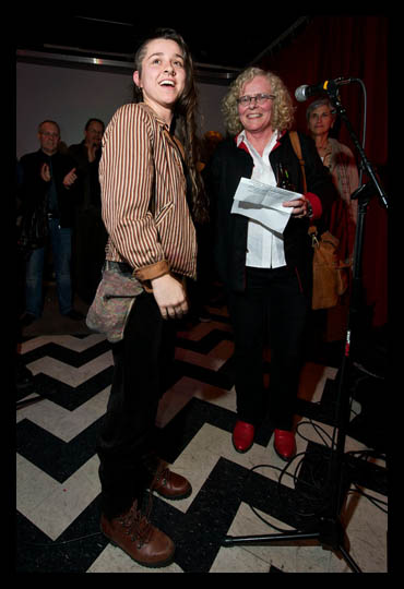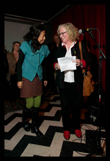 Monica Mirabile accepted one of six one thousand dollar b-grants from, Connie Imboden, on behalf of the Copycat Theatre. This year Baker will award eighteen b-grants total in an effort to inspire artists to profile their work on their website and recognize “the quality and depth of the region’s art scene.”