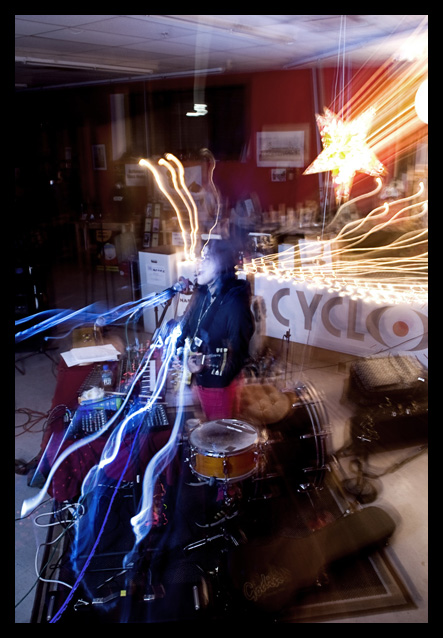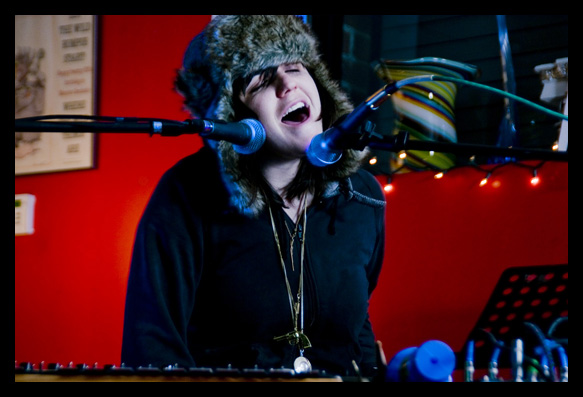Emily Wells performed at Andy Rubin’s Cyclops Books on North Avenue in Baltimore a few weeks ago. She is a musician who’s redefining virtuosity as it relates to the concept of solo performance. She uses analog and MIDI technology to create loops and repeating layers of sound. She performs, records it, and then layers the sounds, one on top of the next, to create lush pop symphonies and trance Inducing hip-hop influenced music. If you close your eyes you’d think you were hearing a whole orchestra, a seasoned one at that. In spite of the table full of blinking boxes, a ten foot radius of twisting wires, and what seemed to be a small cage of microphone stands and musical equipment, her live shows are relaxed, warm and intimate.