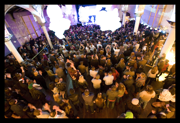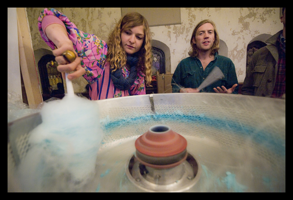 Imagine a sanctuary in a stately old church, slightly worn and crumbling, awash with the glow of warm colors and inundated with music seemingly composed with the intent to enchant the listener. Now imagine, in the space cradled by the vaulted ceiling, white, billowing clouds perched over the heads of a large group of people focused on players who seem to be conjuring some sort of modern mysticism from the pulpit.