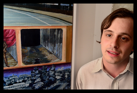 The topic of the river and its history is varied and complex, Curator Teddy Johnson embraced this idea with his layer-cake style painting: “Bury This River,” which has three eras of the river’s history stacked on top of each other. The top layer is the modern highway and the lower layers descend through time. The form also reinforces the idea of the river being covered and concealed.