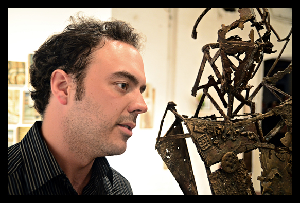 Dominic Terlizzi’s sculpture “Bank Line Greeting Man,” is a collection of bronzed artifacts from the rivers edge that stands at the center of the gallery like an anthropomorphic witness to the history and detritus of the water shed.