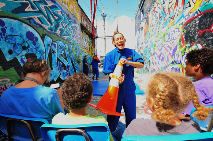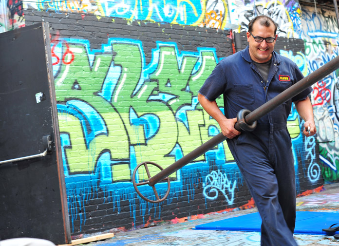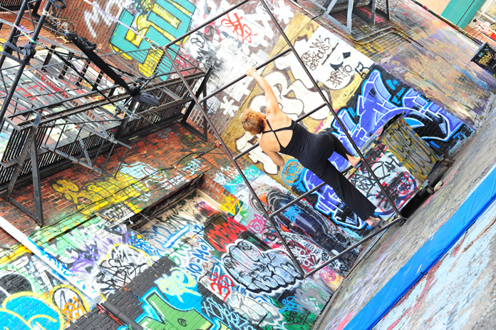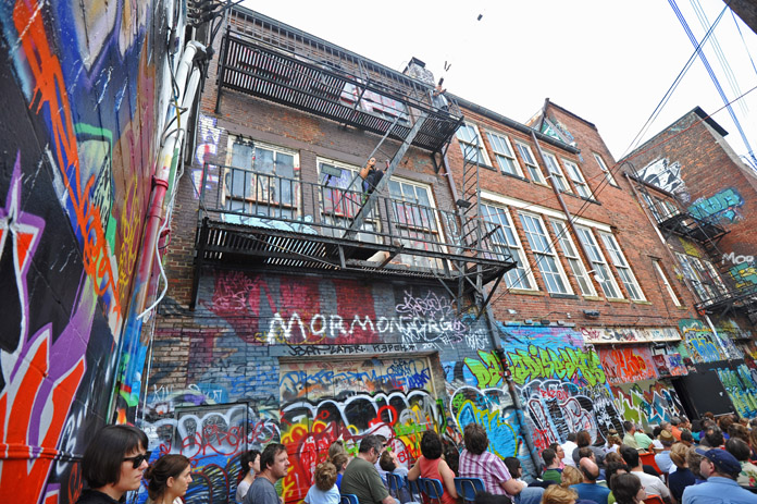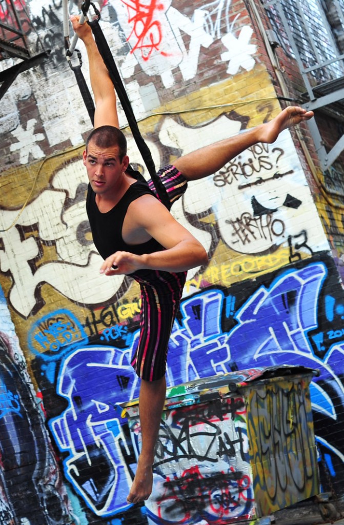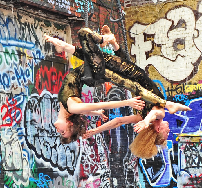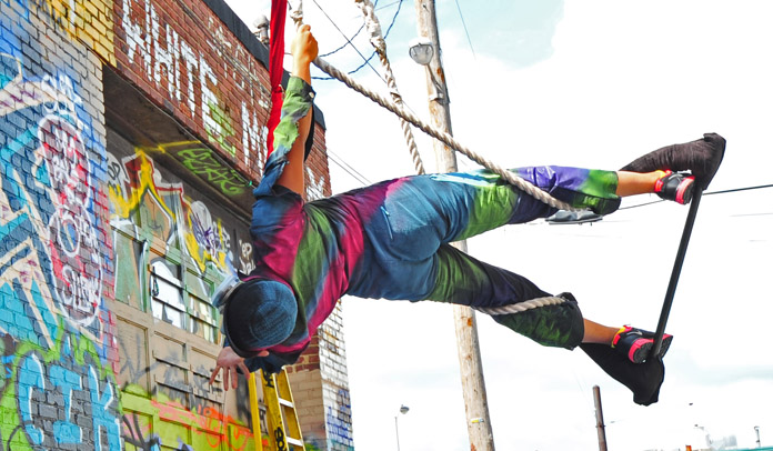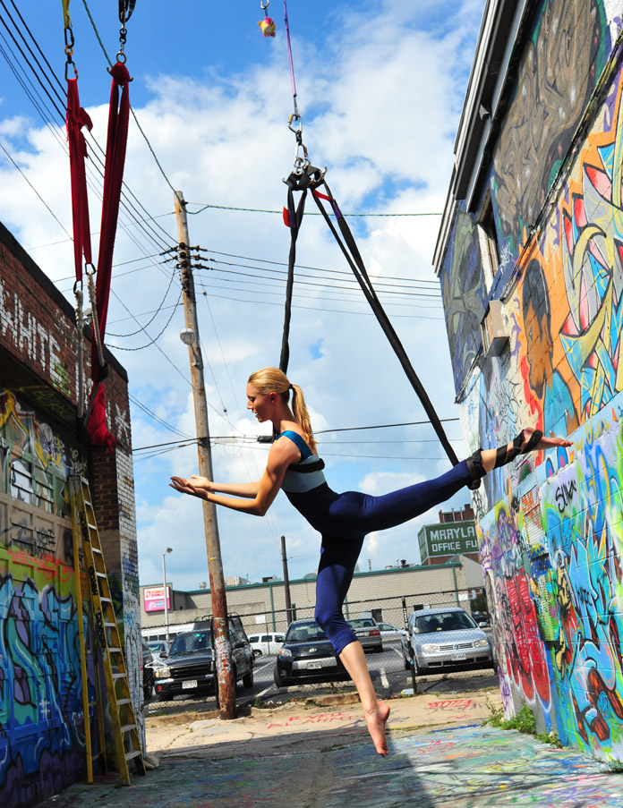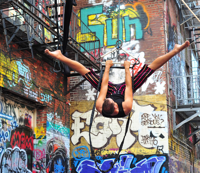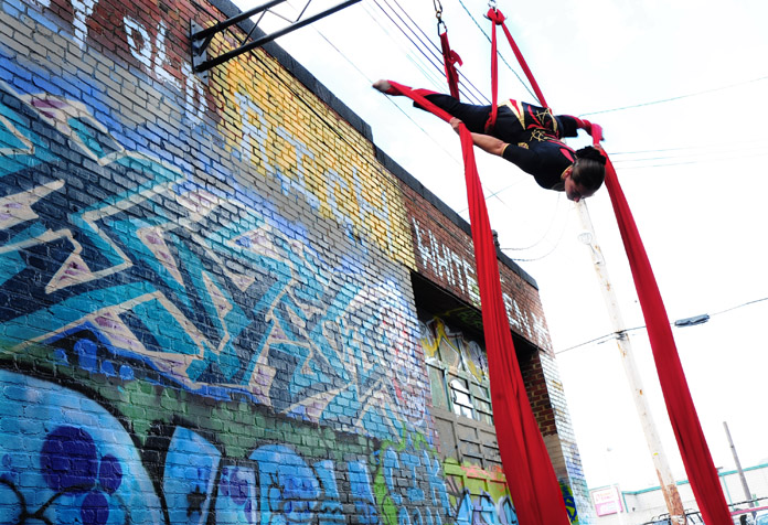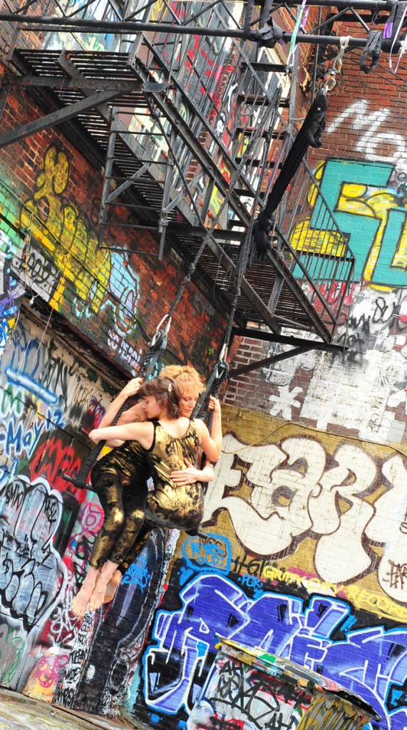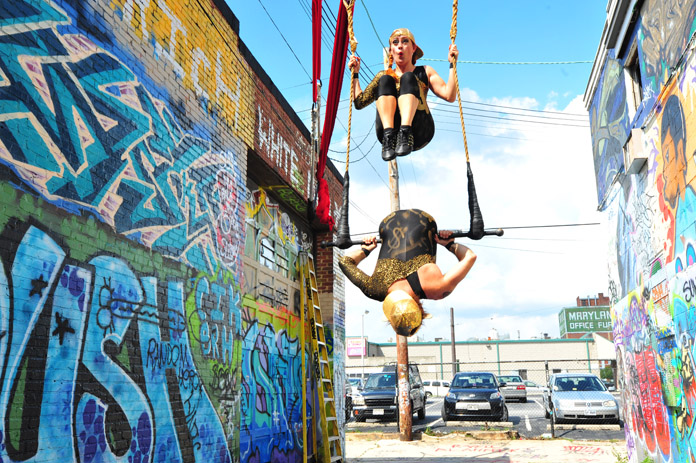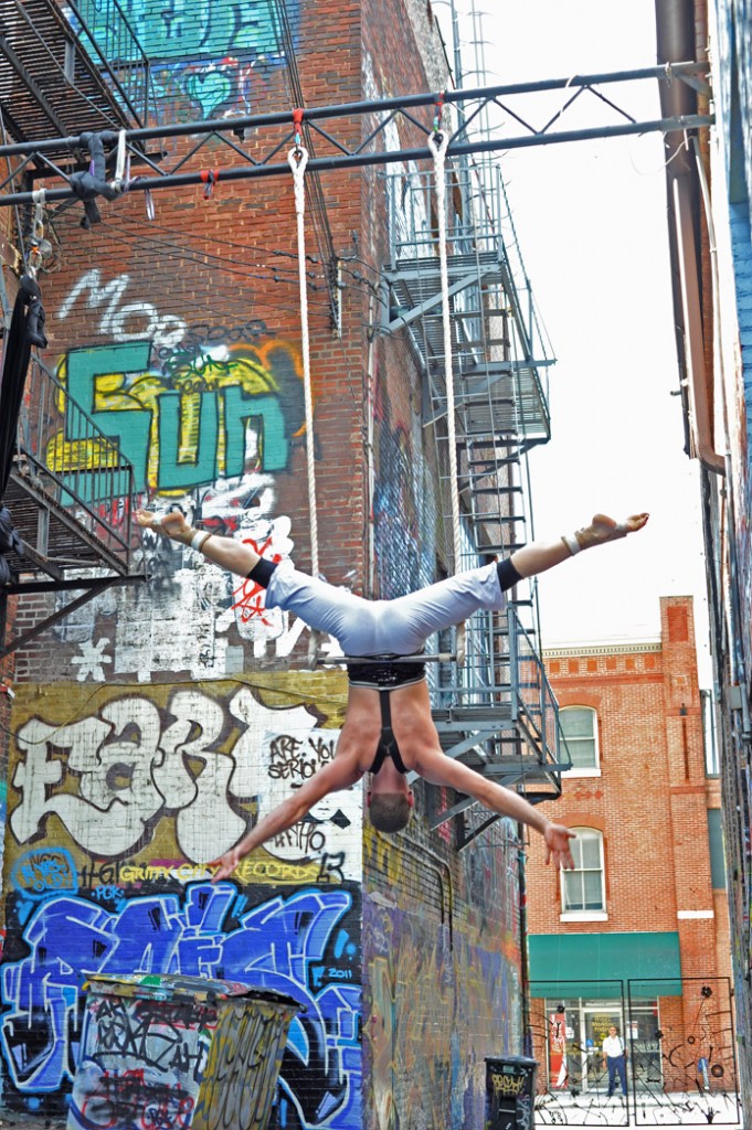 In-Flight Theater’s Alley Arial Festival is a showcase for the exploration of aerial theater that broadens the definition of the art form. Here is where we get to see Baltimore artists setting trends instead of following them. This year’s festival featured an eclectic assemblage of performers, from those who displayed an impressive level of strength, endurance, and grace, to yet others who explored music, prose, and performance art with rigging as their stage. The entire afternoon was framed by a quirky, comical, vaudevillian narrative expertly acted out by founders of the festival and hosts, Mara Neimanis and Tim Scofield.