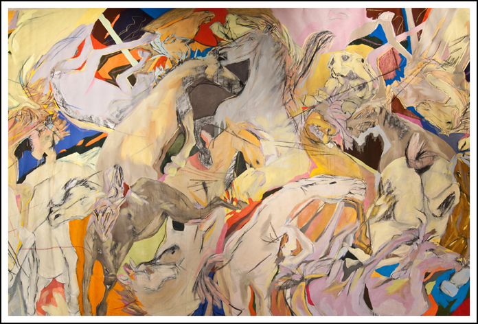 Lauren Boilini grew up in Bloomington, Indiana and graduated from the Mount Royal School of Art in Baltimore in 2008. She has exhibited throughout the East Coast and Midwest, and recently returned from the Jentel Artist Residency in Wyoming; the two massive paintings she completed there will be shown for the first time in Mothership Connection. Boilini’s paintings often feature dualing opposite forces in fights, orgies, and races that are violent, chaotic, yet sublimely beautiful in their precarious states.