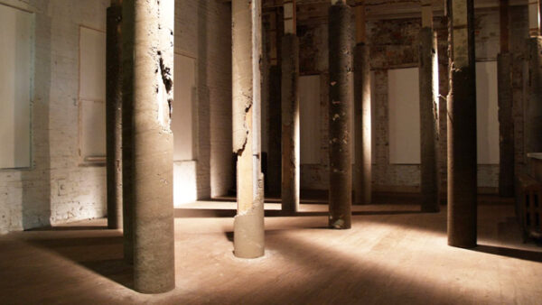 Lundgren’s concrete installation takes the viewer to a very different place of meditation and scrutiny in a forest of vertical forms, some of which reveal gashes, bubbles and embedded objects, others are smooth and flawless and lead the eye up to the ceiling to recognize their connection to the surrounding structure.