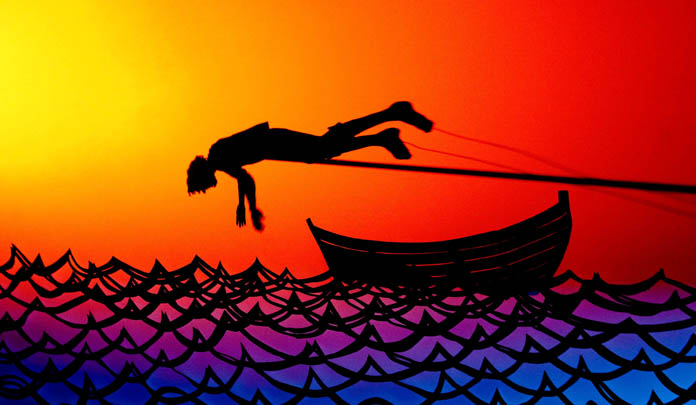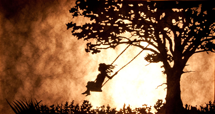 ellen cherry (ec): Having just dipped my toes for the past few years into the world of shadow puppetry, I understand now that these artists simply have an amazing way of viewing the world. Kathy has this great talent for seeing how shapes can be silhouettes and how they can be layered against different backgrounds to be evocative. She also can use different materials to create a visual trick of distance. I don’t want to reveal all of her hard won secrets, but when she explains to me how she creates some of these visual elements, I’m just stunned at how she does it. Part of her talent lies also in her dedication to her craft: she works very meticulously and is focused on accurately representing images. Several times I would show up at her house and she would show me pages of developing images, dozens of sketches in progression, and books from the library, carefully notated with post-its. All of this would result in crisp, detailed, and accurate images illuminated against the screen.
