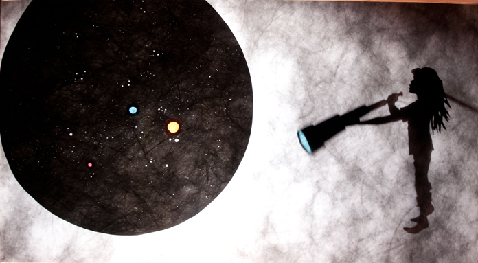 Then there’s the crankie. It keeps moving, it’s all connected. One of the great challenges of making a crankie is, OK, I’m going to have a little girl with a tree, and now I want her looking through a telescope, and now I want another version of her, and now we’re in outer space. It has to be one long—it has to make sense when you crank it, when it moves across. It’s a panorama.