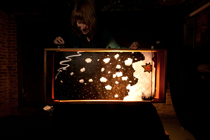 ec: I honestly had no expectations when it came to the final crankie. I knew that I wanted some of it to “tell the story” of the song, but to also have her influence, especially in the middle section, where there are no lyrics, just an instrumental break–it is almost meditative. I really wanted to be hands-off and allow Kathy to create the visual telling of what I had done with words and melody. Her crankie “story” moves from an earthly one to a dreamy outer-space scene and during the instrumental break, she brings us back to “earth” in a way. She moves from meteors to bomb explosions and I thought this was just something that only Kathy could do–only she could think of. She tied the scenes so well together. From the audiences we’ve already performed this for, I’ve heard so much about how evocative and emotional, and also whimsical, it was to watch this “lo-fi” visual theater (in a box!). And even now, I don’t play or practice the song without imagining the scrolling scenes that are already very much married to the song, in my mind.