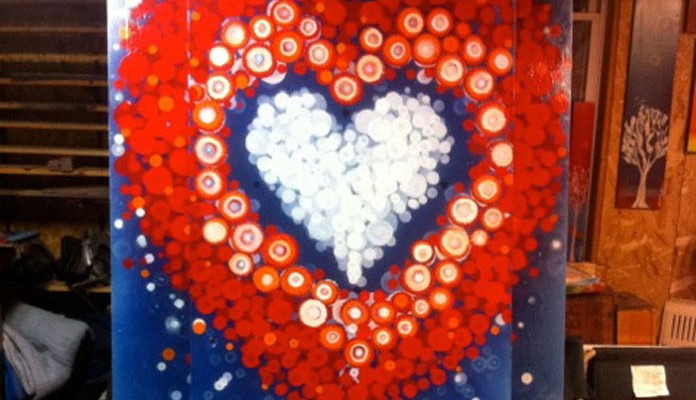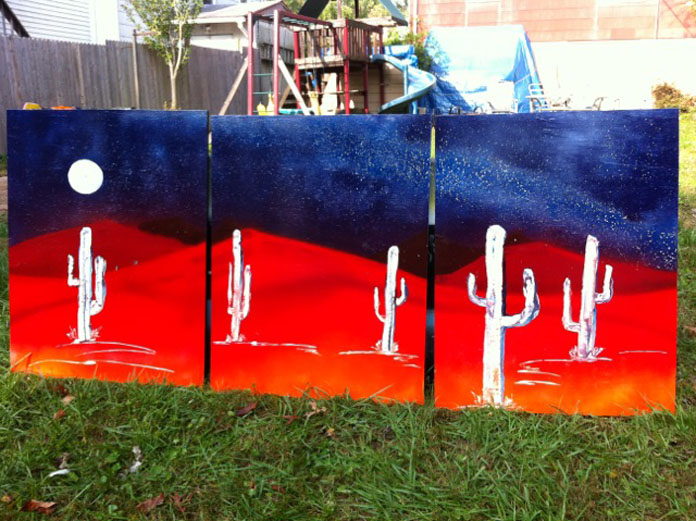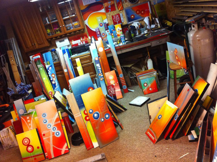 When you step inside Shawn’s studio, a garage-sized building Shawn’s father built in the back yard for him, your eyes burn from the paint fumes. The walls, the floor, are stacked with paintings in various stages of completion, between glossy, ready-to-hang SOGHs and plain kitchen cabinet doors.