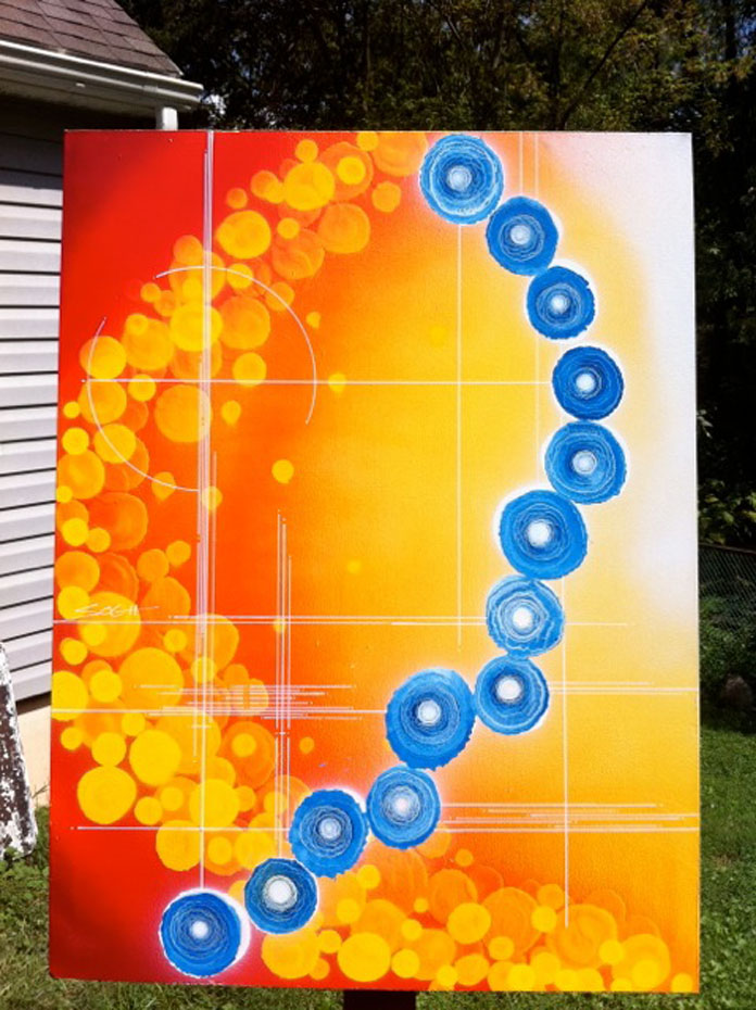Pointing to an individual painting, Shawn explains the meaning of its shapes. “These are points of life,” he says, referring to the bright spheres, “representations of life energy we all have, from a single cell to a human being to a planet.” A bit like the points of life in Shawn’s picture wall. Then he points to the line leading to and away from the sphere: “This is a life path… we can all see where we’ve been going, and a little bit ahead.”