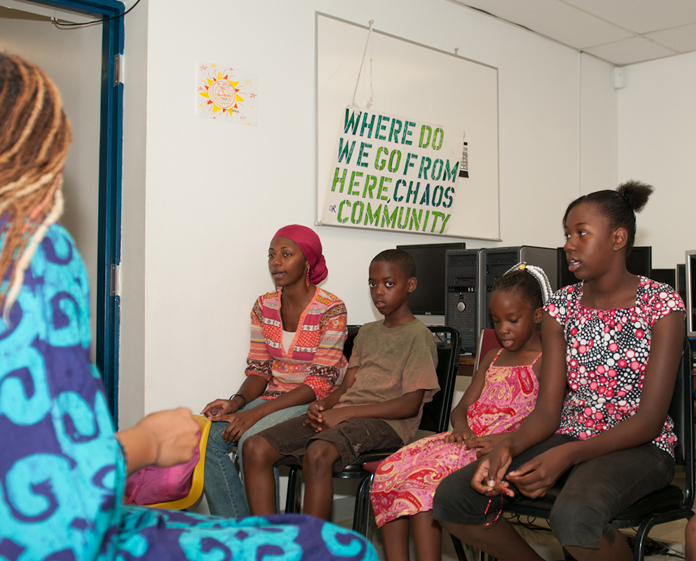 “Who controls the media in Baltimore City?” reads the construction-paper sign, in a basement computer lab in Cherry Hill Public Homes. Around it sit Navasha Daya, Fanon Hill, and eleven campers at A Dream In Cherry Hill.