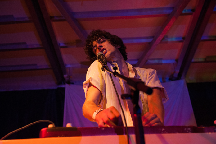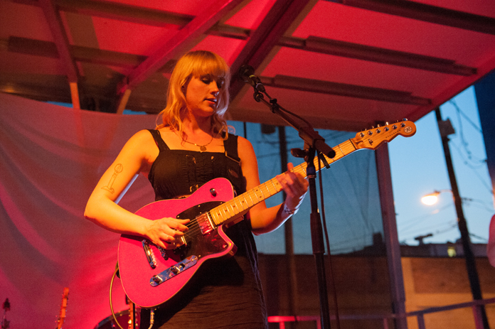 Late afternoon on Saturday, after nursing my aching brain, and taking some slow-time to get my proverbial shit together, I arrived just in time to catch the last groaning & smashing bits of Witch Hat’s skull cracking noise-thrash assault on the St. Paul Stage. They were followed by one of Baltimore’s best known and most popular duos, Weekends, whose set both literally and figuratively brought down the rain, cutting their performance a bit short as sound guys grappled with blue tarps to cover the speakers and monitors.