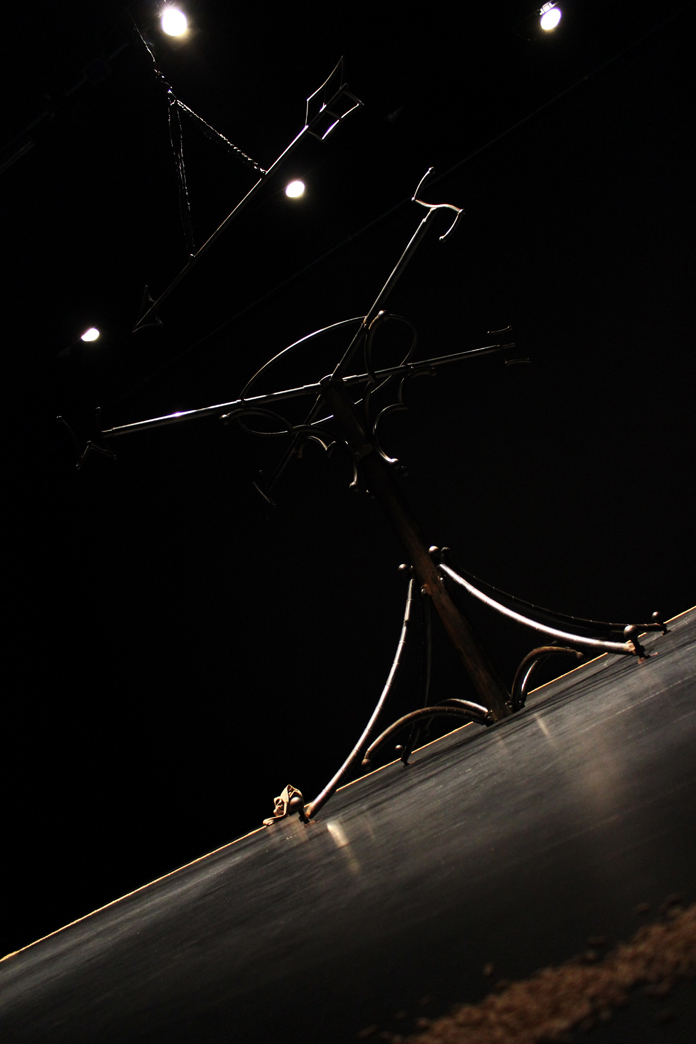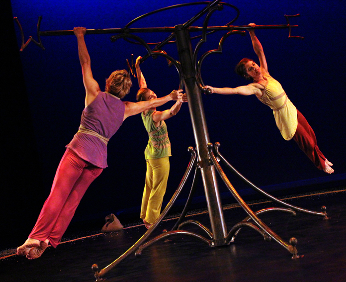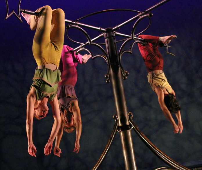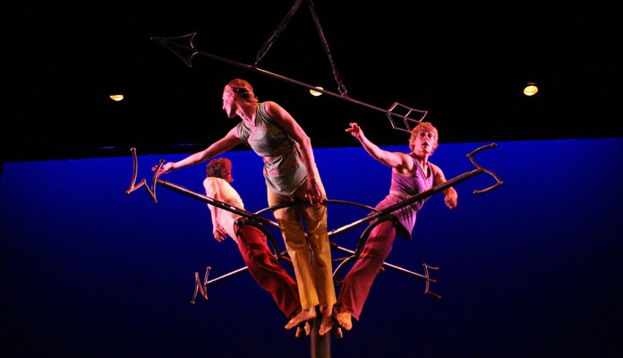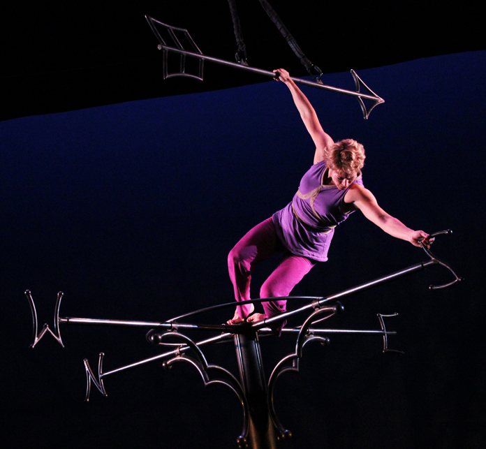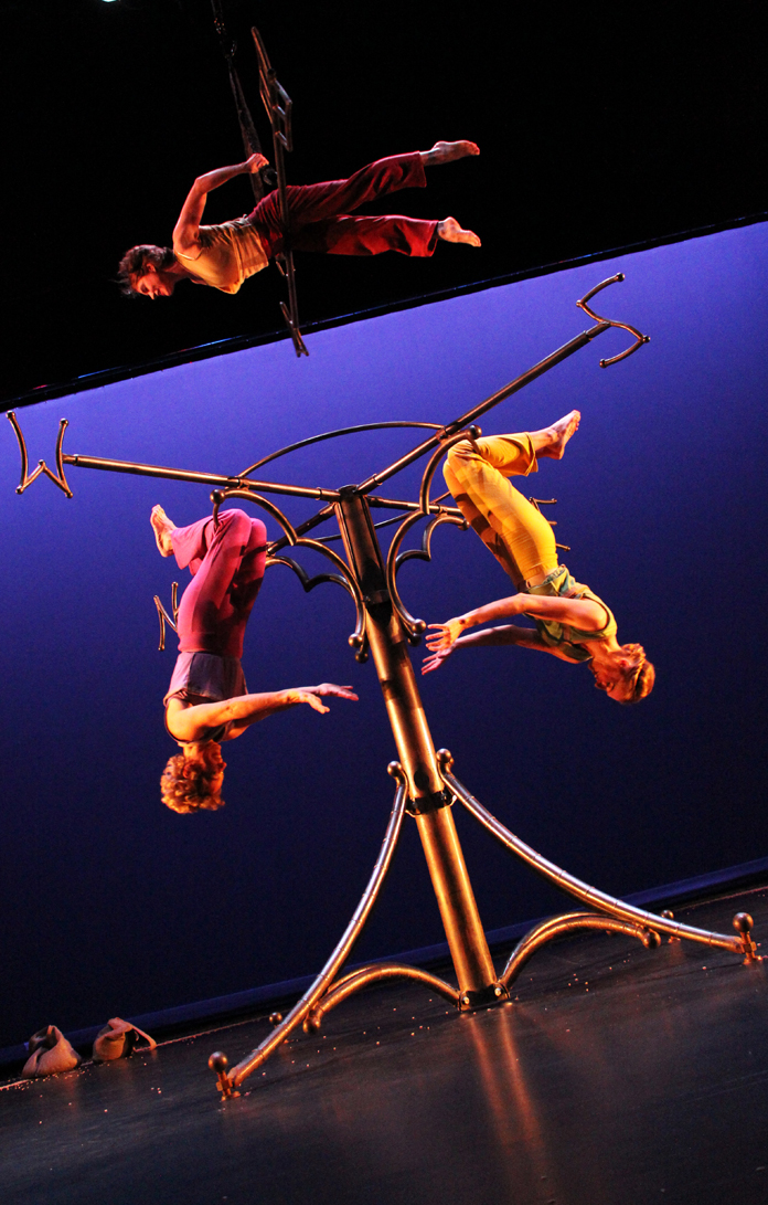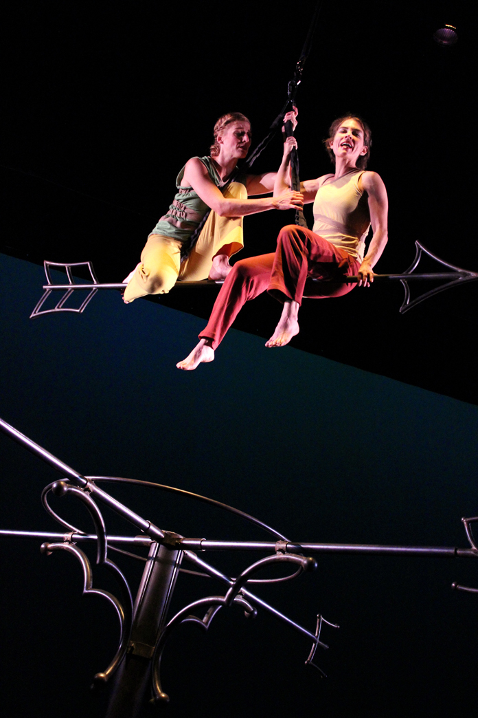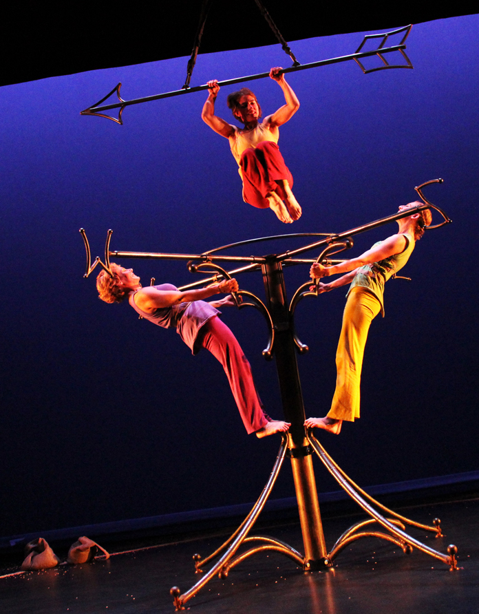 The three actors in the show play many roles and characters throughout the performance. The one character that remains throughout the evening is the aerial apparatus that sits at the center of the stage. The set is a large steel structure, appearing much like a giant weather vane with a giant arrow suspended above. This original apparatus emerged out of Mara’s long time collaboration with sculptor Tim Scofield, who has created many of Mara’s aerial structures and devices.