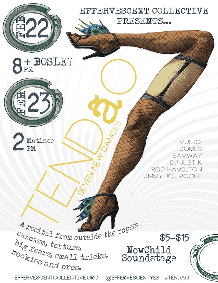 Tendão is an oxymoron, a cabaret of raw beginnings enabled by our age as an organization and the passing of time as a continued presence in Baltimore. Effervescent Collective is–holy shit–going on five years old. We’ve been producing multiple dance based wonders a year in and around Baltimore for the last three years. Name a space with any substantial square footage, and we’ve danced there. We have cracked the Natty Boh on new spaces for dance; our own short-lived Lumberhaus, the Coward Shoe, and most recently Now Child Soundstage. We’ve worked on innumerable musical collaborations. We’ve thrown down for any festival open to dance, with a loyalty to High Zero’s commitment to presenting of avant-garde dance making.