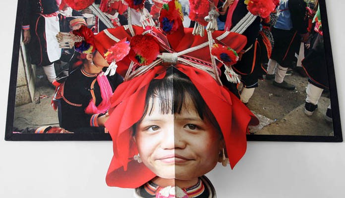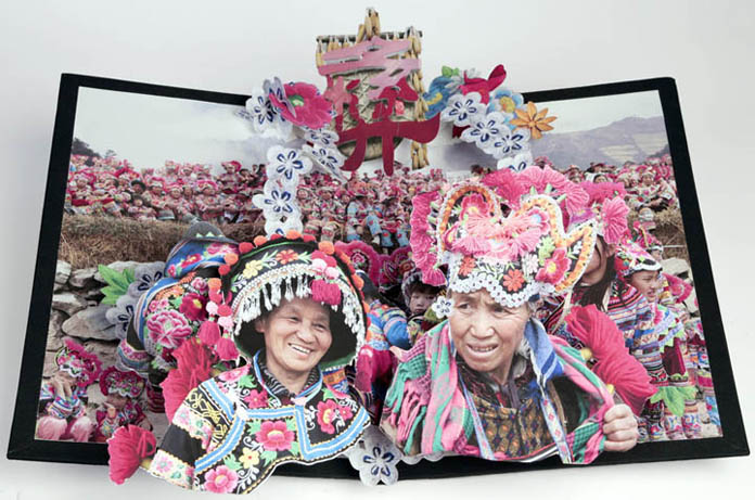 I recently stopped by Towson University’s Asian Arts Gallery to check out We are Tiger Dragon People, an exhibition by Philadelphia-based artist Colette Fu. Fu explores her Chinese heritage in a series of photographic pop-up books, a display of artifacts, and a few photographic wall panels. The work centers on the Yunnan Province, a southwestern region of China bordering Vietnam, Laos, Burma, and Tibet, home to over twenty-five ethnic minorities rich with diverse traditions. Fu’s great-grandfather was the provincial governor of the area during World War II. Supported by a Fulbright fellowship and driven by the call of her ancestral roots, Fu spent 2008 photographing in Yunnan Province.