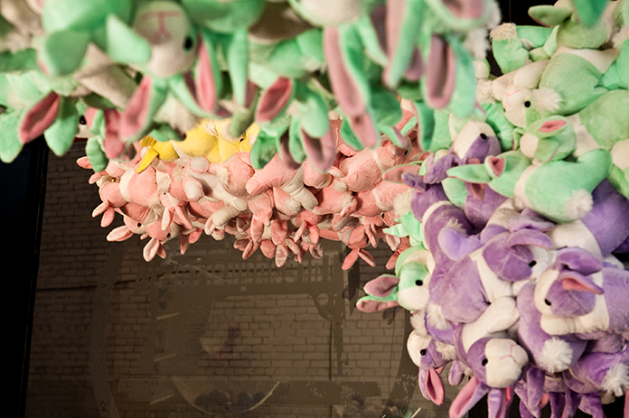 Inside BTQ, three clouds of ready-made stuffed bunnies clustered in lavender, pink, and mint float from the left-hand corner ceiling. These amorphous assemblages are a mass of eyes, tails, and ears poking out. Directly below, stuffed white rabbits (or their parts) litter the shaggy lime carpet. The largest figure, a hand-sewn grayish brown felt bunny perches on its hindquarters in the background. It might be this eyeless, shadowy figure that sharpens the piece’s edge and pushes it beyond a seemingly happy scene.