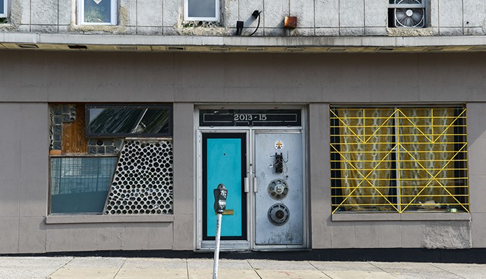 When a show is in the progress of being installed or the gallery is closed, there is often a painter’s tarp covering the window. Before or after business hours at sophiajacob (any day of the week besides gallery opening night, Saturday 1-4pm, and personal appointment), the lights are turned off. This means that during the run of an art exhibition, for most of the hours that there is art installed, the lights are off. (Once while perusing the gallery’s garbage, I accidentally saw their light traffic via BGE bill.) This fluorescent-lit gallery becomes a very dark space during the hours it is closed—which is most of the week! How does this gallery exist within or in response to the street activity surrounding it?