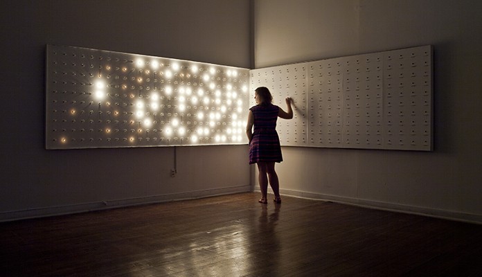 Subject to Terms and Conditions is experiential. The only light in the room emanates from the filigree of Daly’s 200 bulbs. The dimness of the room leads viewers to the sculptural elements like moths to a flame, and the ambiance is both meditative and light-hearted, as the audience-turned-participants try and discover which of the 200 switches controls which bulb.