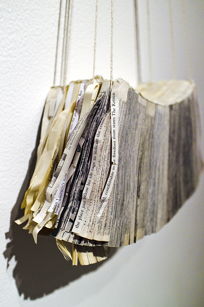 Near Away, a dynamic work hung in the central gallery at Goya, is a pale pinkish yellow papier-mâché glove hung from the wall with black wire just below eye level. At Goya, the viewer could peer inside into a dusty rosy interior. Next to the glove was a booklet of newsprint suspended with twine. A cross-section of printed pages shredded into strips, this booklet was a gradation of greys, yellows, and crumpled edges. This humble pairing of glove and book begged for human touch; I can still easily imagine sliding my hand into the glove to flip through the pages of the booklet.