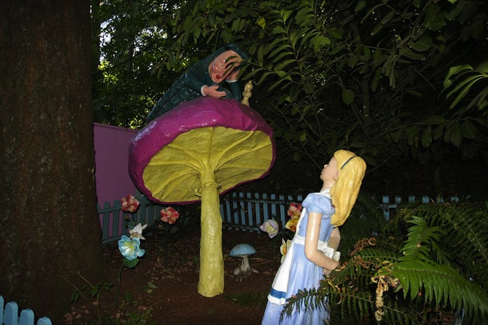 In addition to being literal, I also became anxious about the “real” risks of these kinds of fantasy parks, rather than the imagined dangers of big bad wolves. Famously, I refused to enter a pirate ship tourist attraction at the beach because I deemed it a “fire hazard.” When a ride involved going into small, dark spaces, I talked a lot about being “claustrophobic,” a word I had learned to describe the intense panic I felt in elevators. Looking back, I think I really was afraid of some of the characters at Enchanted Forest, but I couldn’t admit it. It was easier to focus on pragmatic concerns than explain why Alice suspended above me in a perpetual fall— arm outstretched, whites of her eyes glowing above her eyeballs, mouth open in a silent, high-pitched scream— was so utterly terrifying.