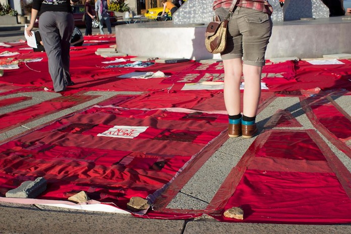 Amid the numerous movements surrounding the eradication of rape and rape culture, one Baltimore-based group has devised a unique way to acknowledge the stories of survivors while offering a safe space to share, grieve and heal. FORCE: Upsetting Rape Culture is an Artist-Activist group that’s receiving international attention for the socially-charged, clever tactics that they employ to expose and eliminate rape culture. Their latest project, The Monument Quilt, is a crowd-sourced collection of thousands of stories, one for each quilt square from survivors of rape and abuse as well as their allies. “By stitching our stories together, survivors are creating and demanding public space to heal.” says Hannah Brancato, FORCE Co-director. FORCE’s thoughtful execution of the project has garnished an amazing reaction. When displayed in Baltimore and Washington DC, onlookers called The Monument Quilt a safe space to publicly express their pain, and a symbol to remind themselves and others that their experience matters.