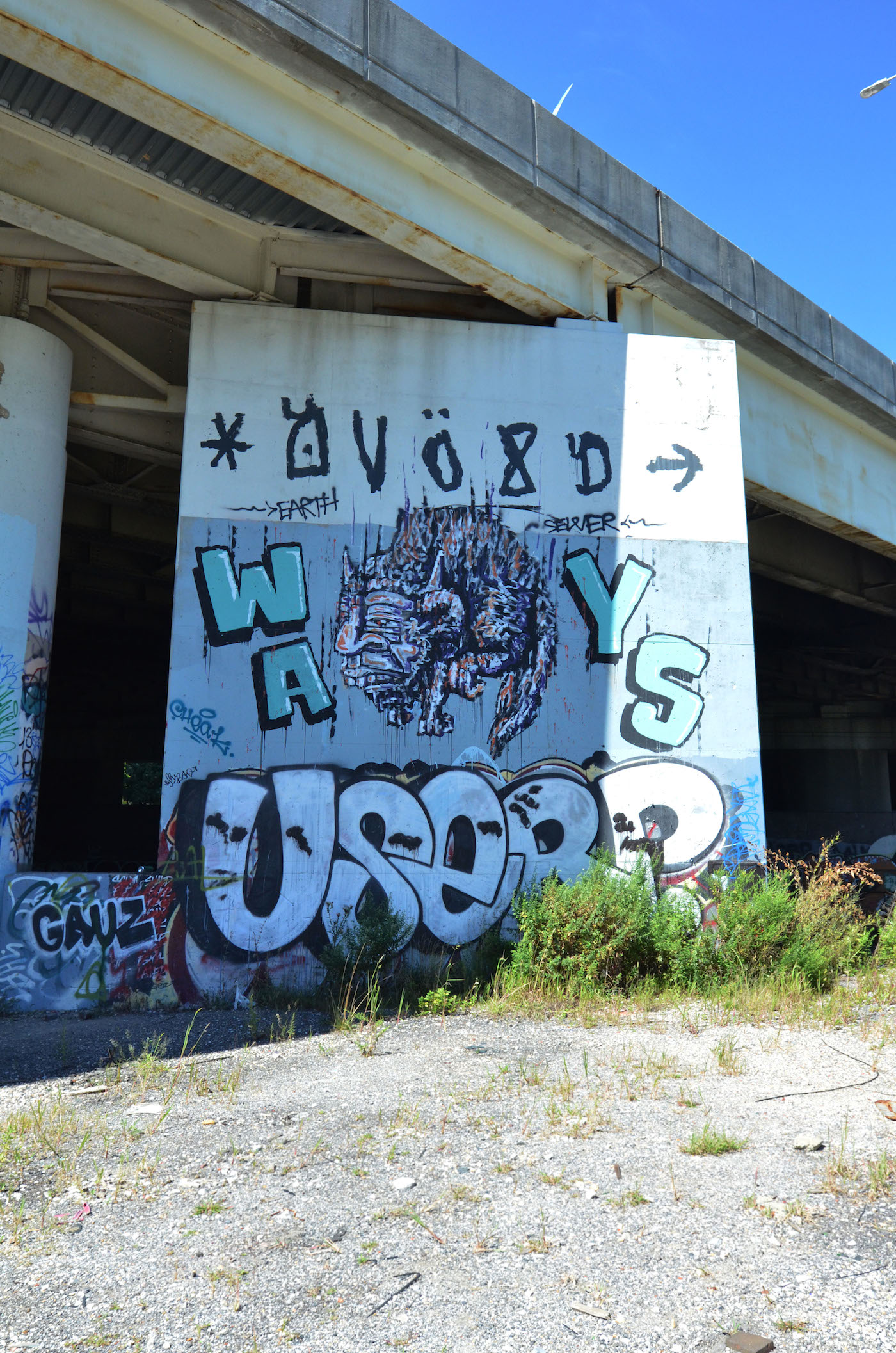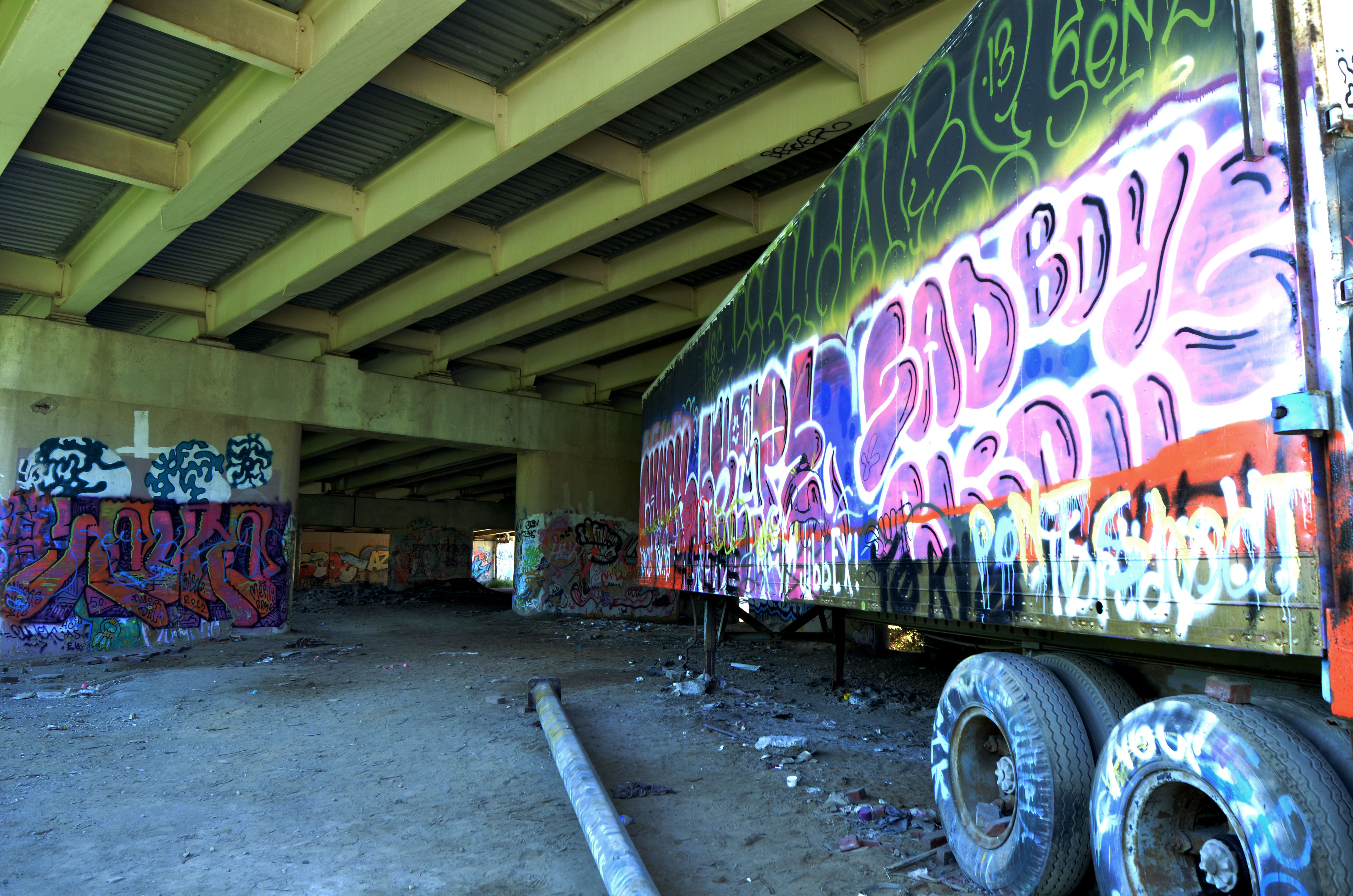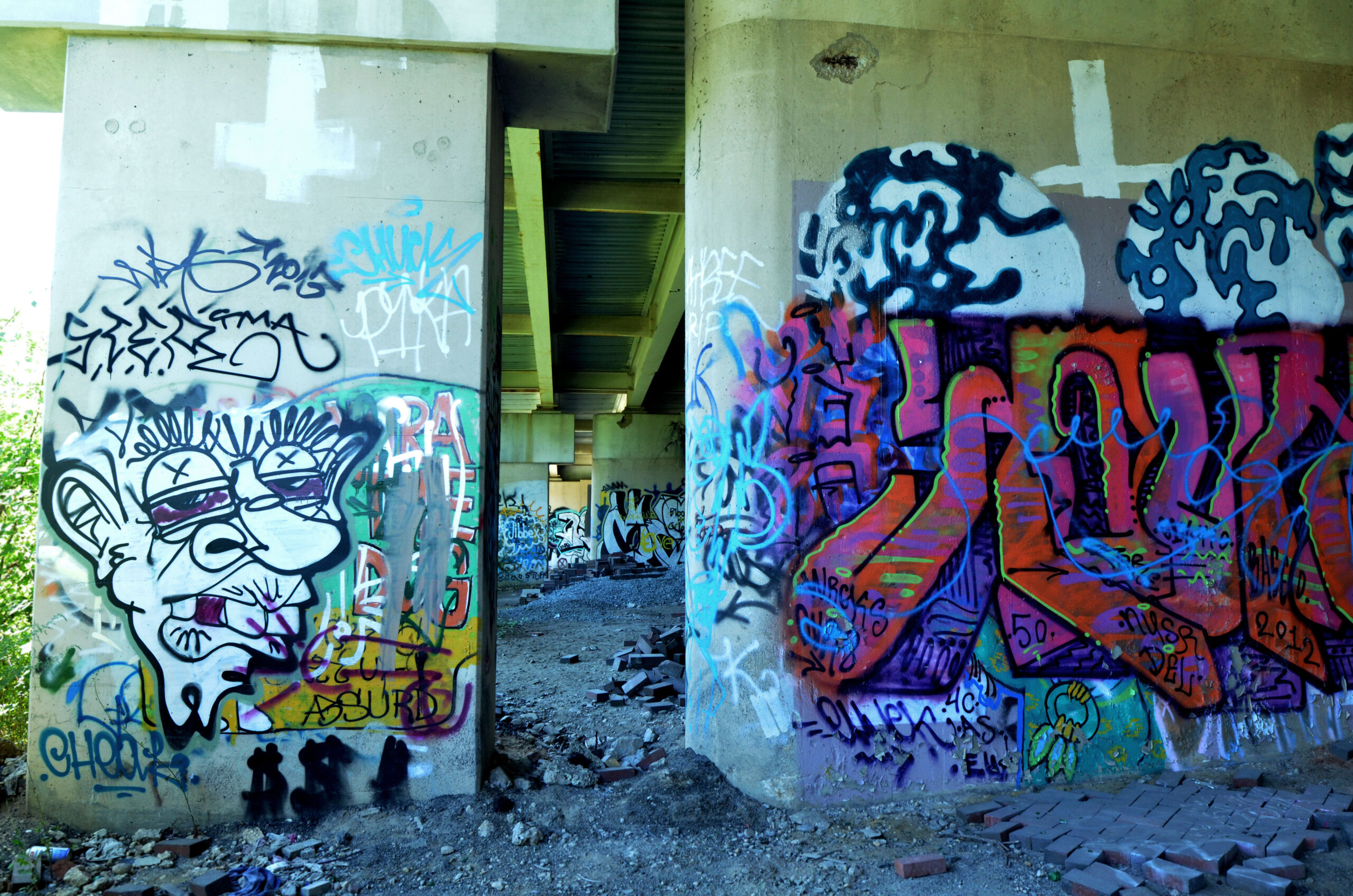 The park isn’t just a “graffiti” park – it’s a multidimensional space most accurately described as an urban art park. Unlike flat land with short grass and a couple of benches, this park acknowledges that it’s in a city. It uses the city as a base for its structure, flowing with the concrete columns that support Baltimore’s infrastructure. It’s an urban space of play, not escape. Located in the heart of Baltimore, behind MICA’s Fox building, underneath the Jones Falls Expressway, and right by Station North, Section1 will take residence in the dynamic concrete jungle. The place is an abandoned, state-owned plot of columns and outer foliage that serves as an illegal dumping ground and home for quite a few feral cats and the work of Baltimore graffiti artists. It’s an organically inorganic forest begging for human creativity.