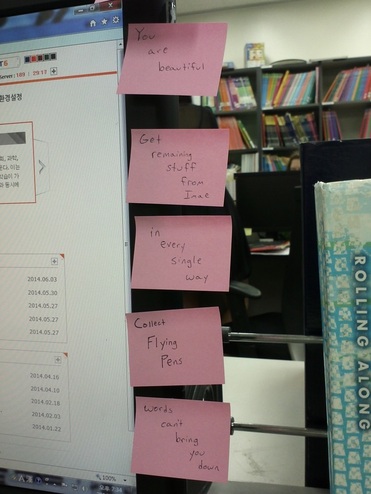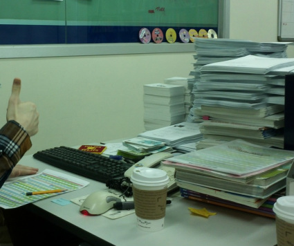 The most hilarious being that the door to the teacher’s room is placed as if the aim were to maximize collisions. Anyone going out is totally blind to whether anyone is coming in until the very last second, and I have even begun walking in a weird loop to get to the door just so I will stop running into people so often. The least hilarious being our computer system, which is almost entirely in Korean, but at least now I’ve got things in my muscle memory. Every once in awhile one of us will still blank though, and say something like, It’s this button to send the memo, right?  The most recent thing being the announcement that this semester we are taking a system that was paperless and now making it on-paper again. Suffice it to say we are not going green anytime soon.