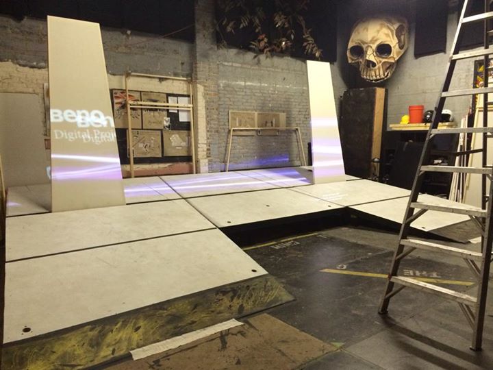 The stage will serve as a canvas for various projection mapped elements. Skelmo from Murdercastle watches the progress. Photo by Zachary Yarosz