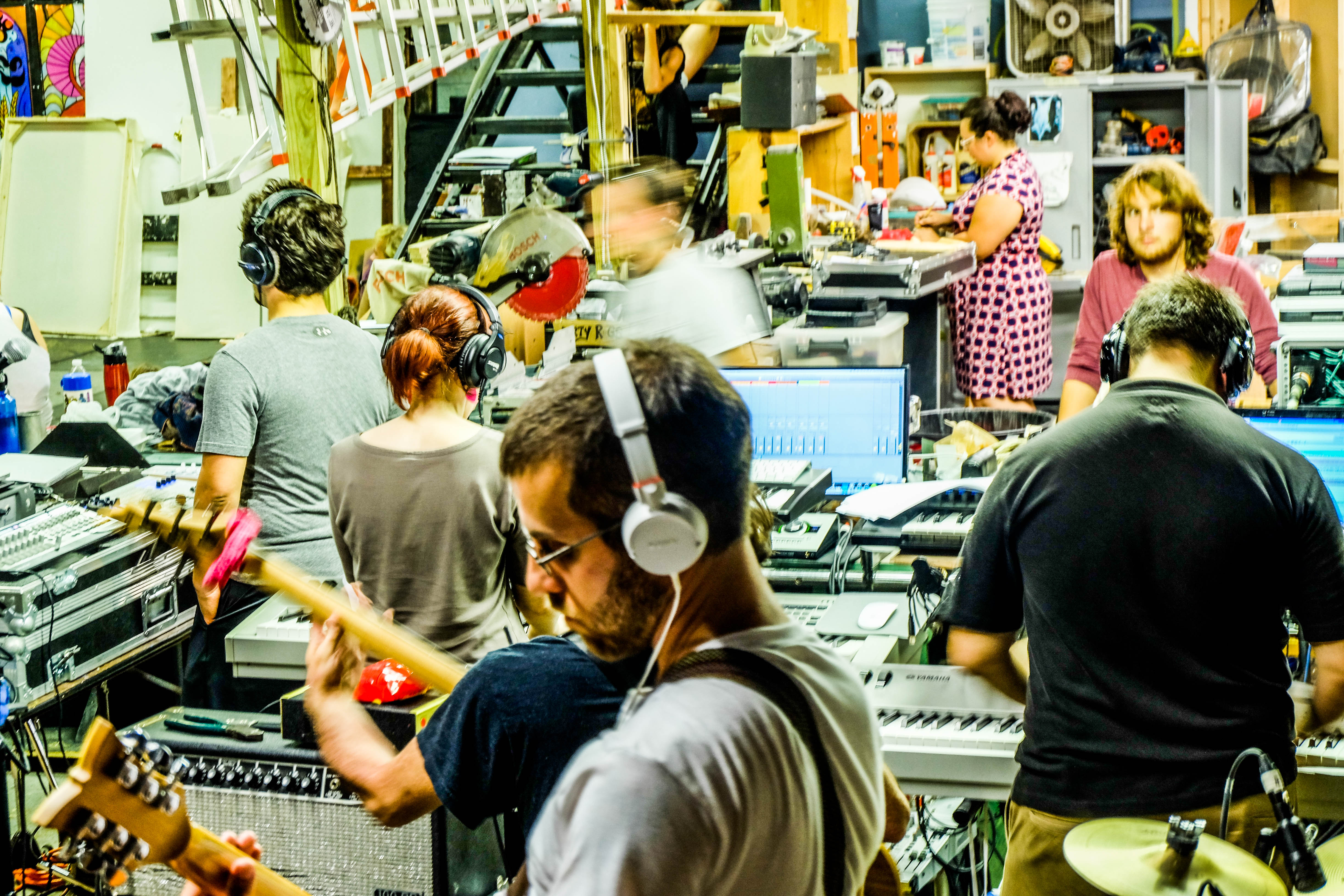 The band is crammed into the BROS HQ Scene Shop for the first Sitzprobe. Photo by Derek Vaughan Brown.