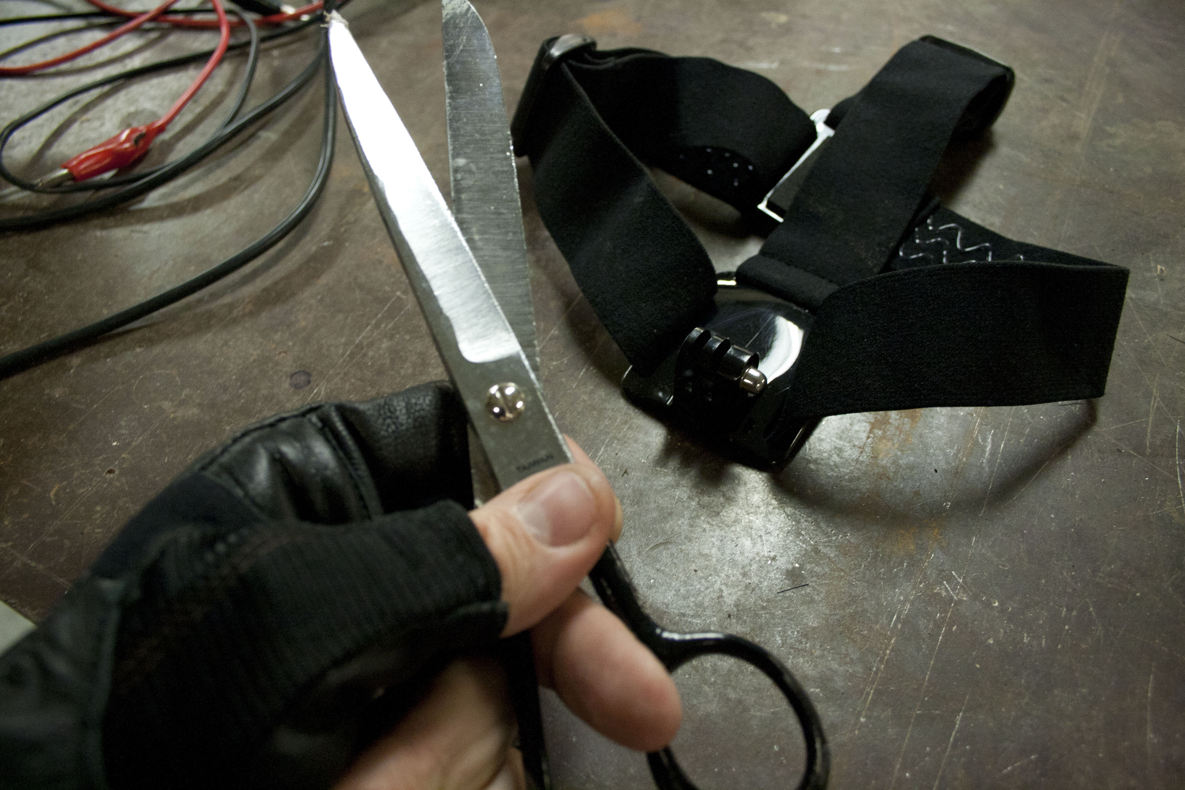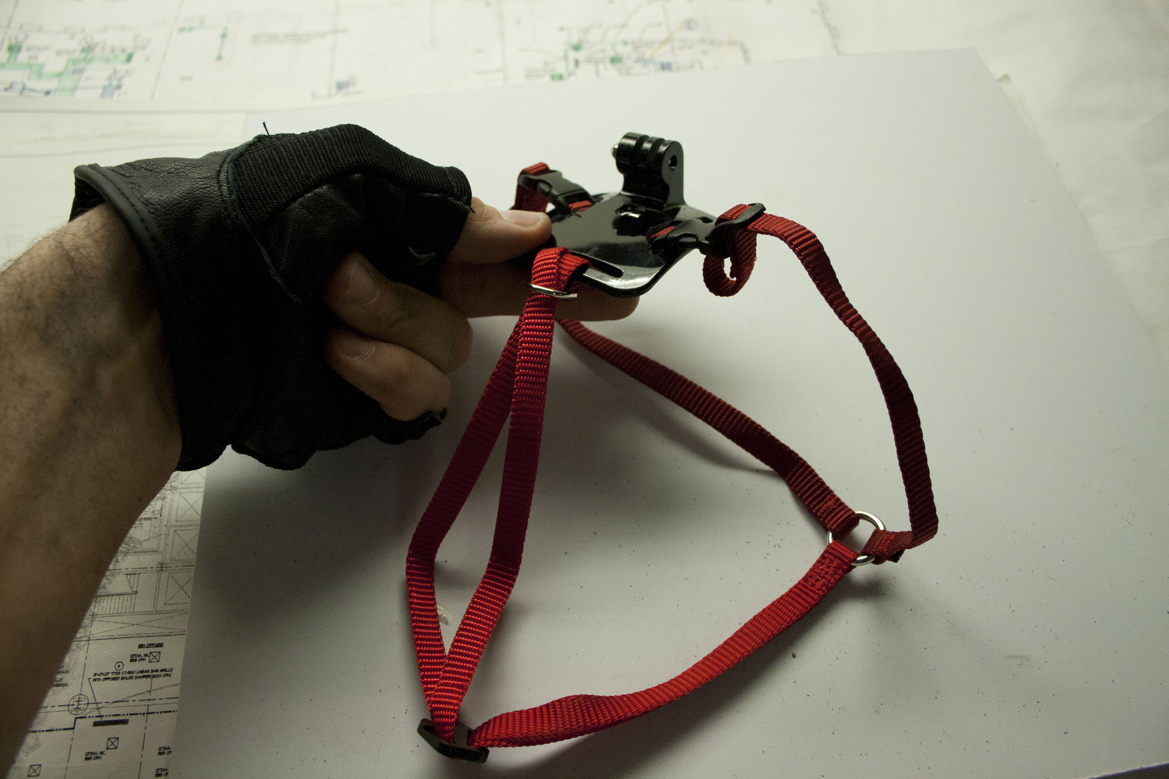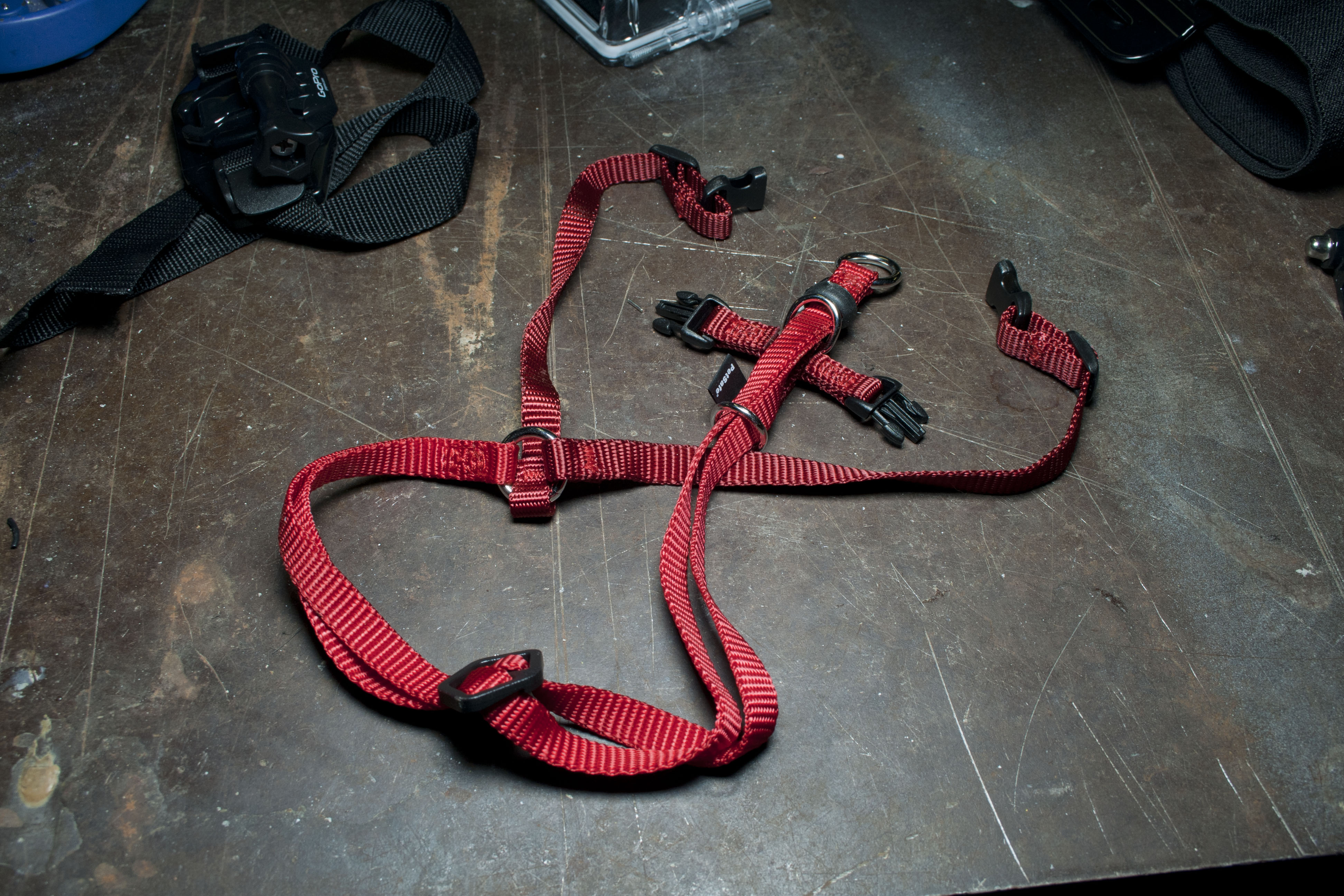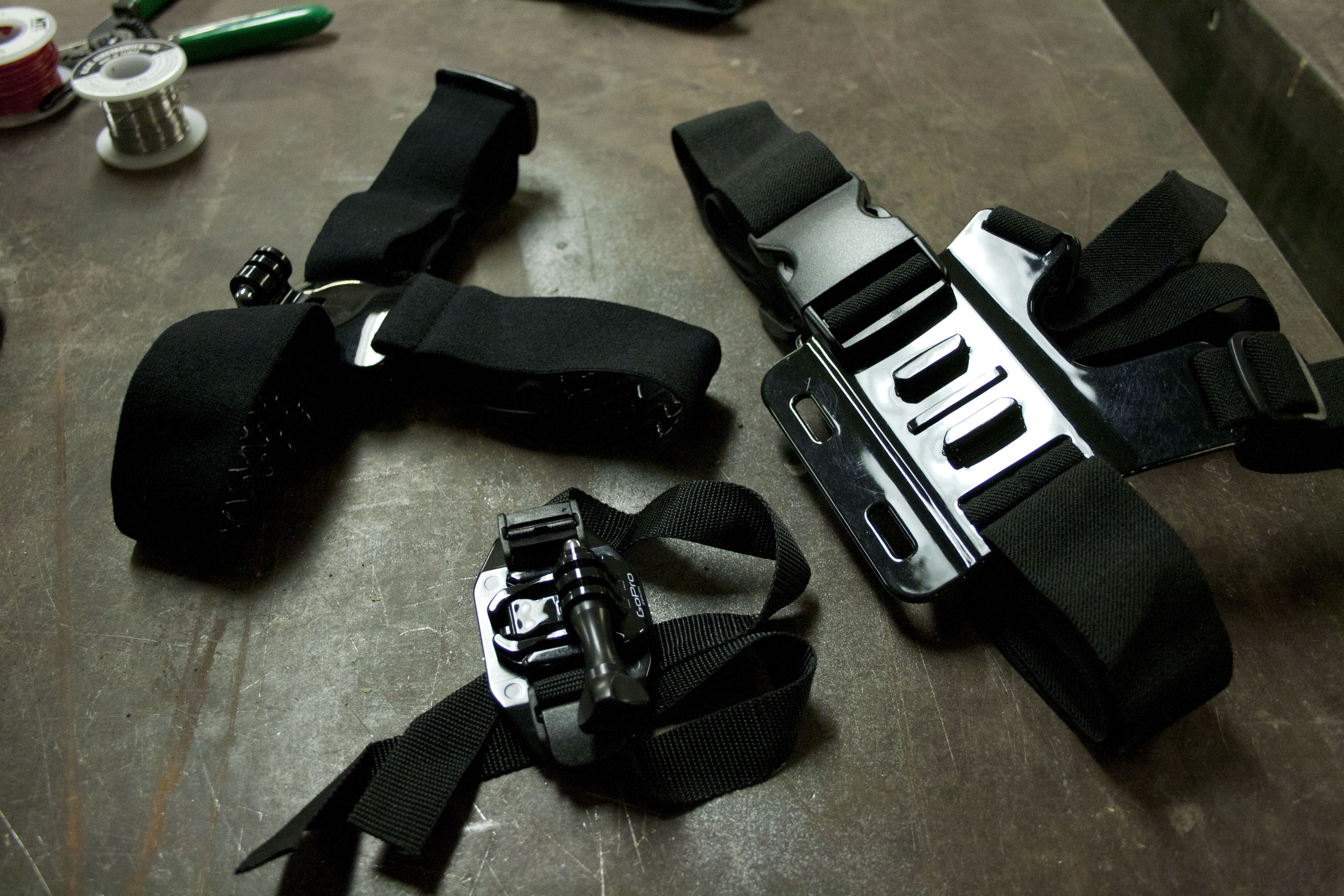 Then I set up my hacker space with everything I would need to make this harness mount thing. So I have three different GoPro harnesses that I got on Amazon and here they are. There’s a head harness, a chest harness, and a helmet harness.