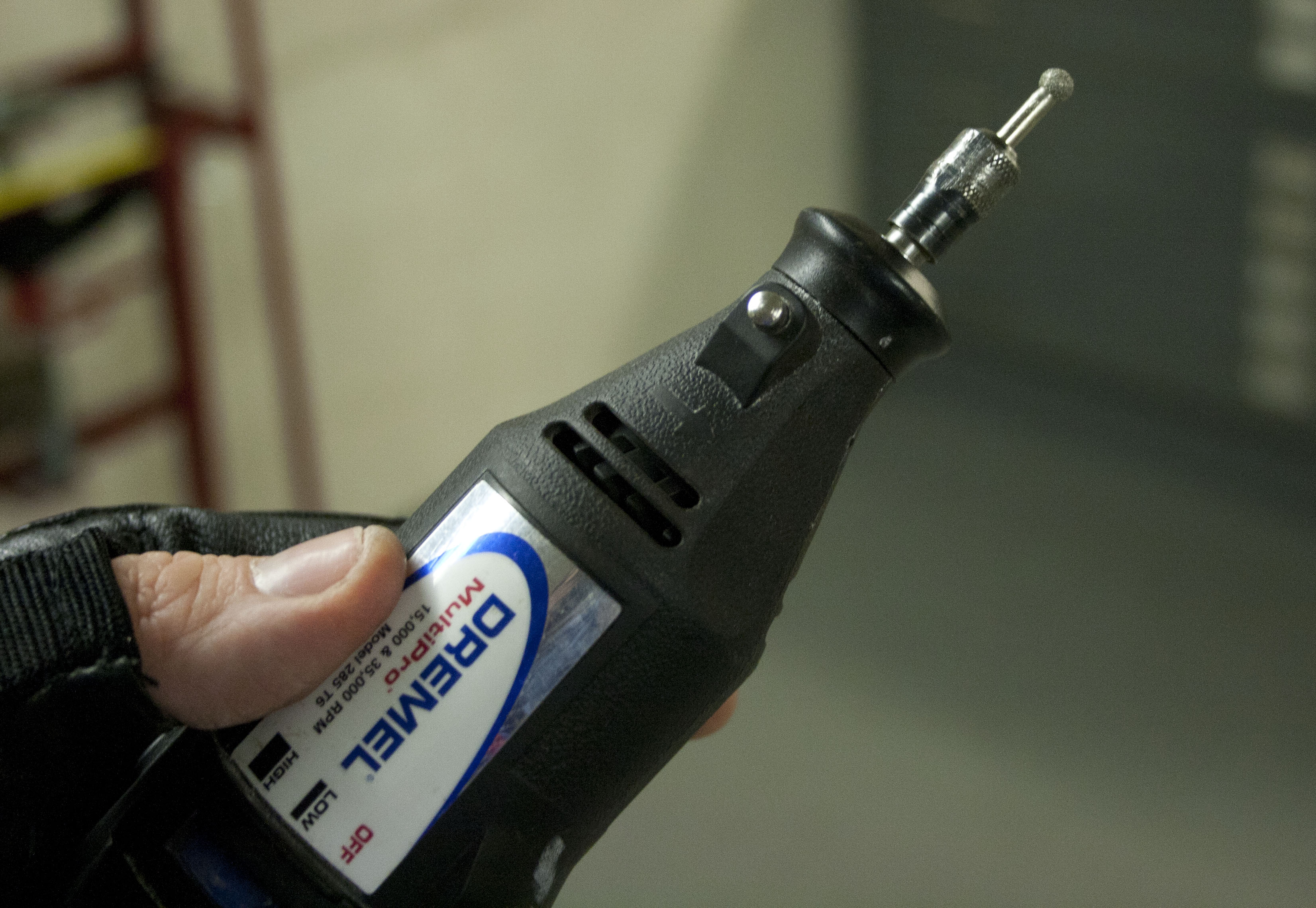 So I had to make those two side slots way bigger, because I want to slip the cat harness clips through them! So I got out this Dremel tool and put the ball end tip on it.