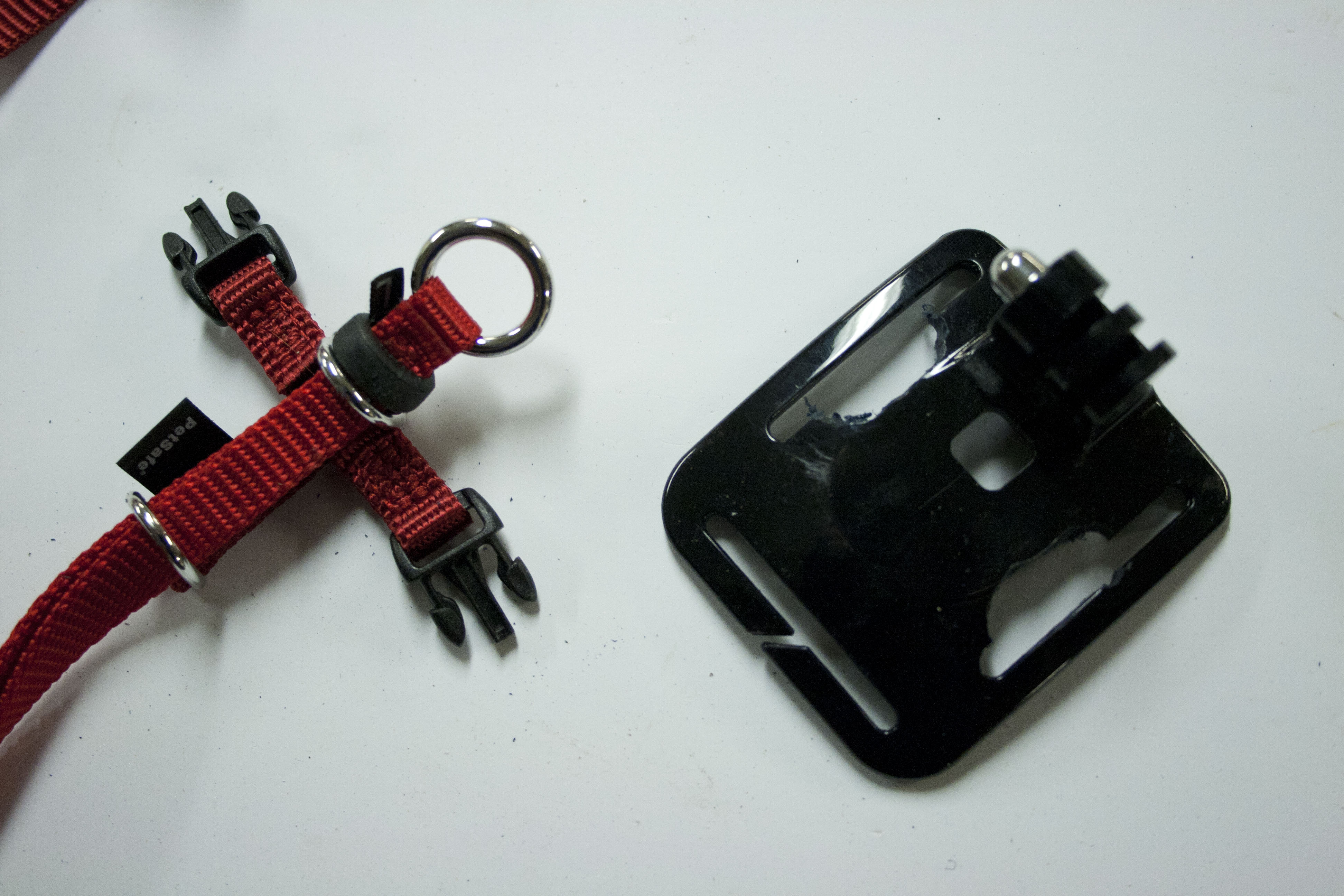 I examined my GoPro harnesses and because cats don’t like heavy stuff I ruled out the chest harness. But, there needs to be some substantial bottom plate to keep the camera from just diddling around all over the cat’s lumpy back so I went with the middle ground which is the head harness.