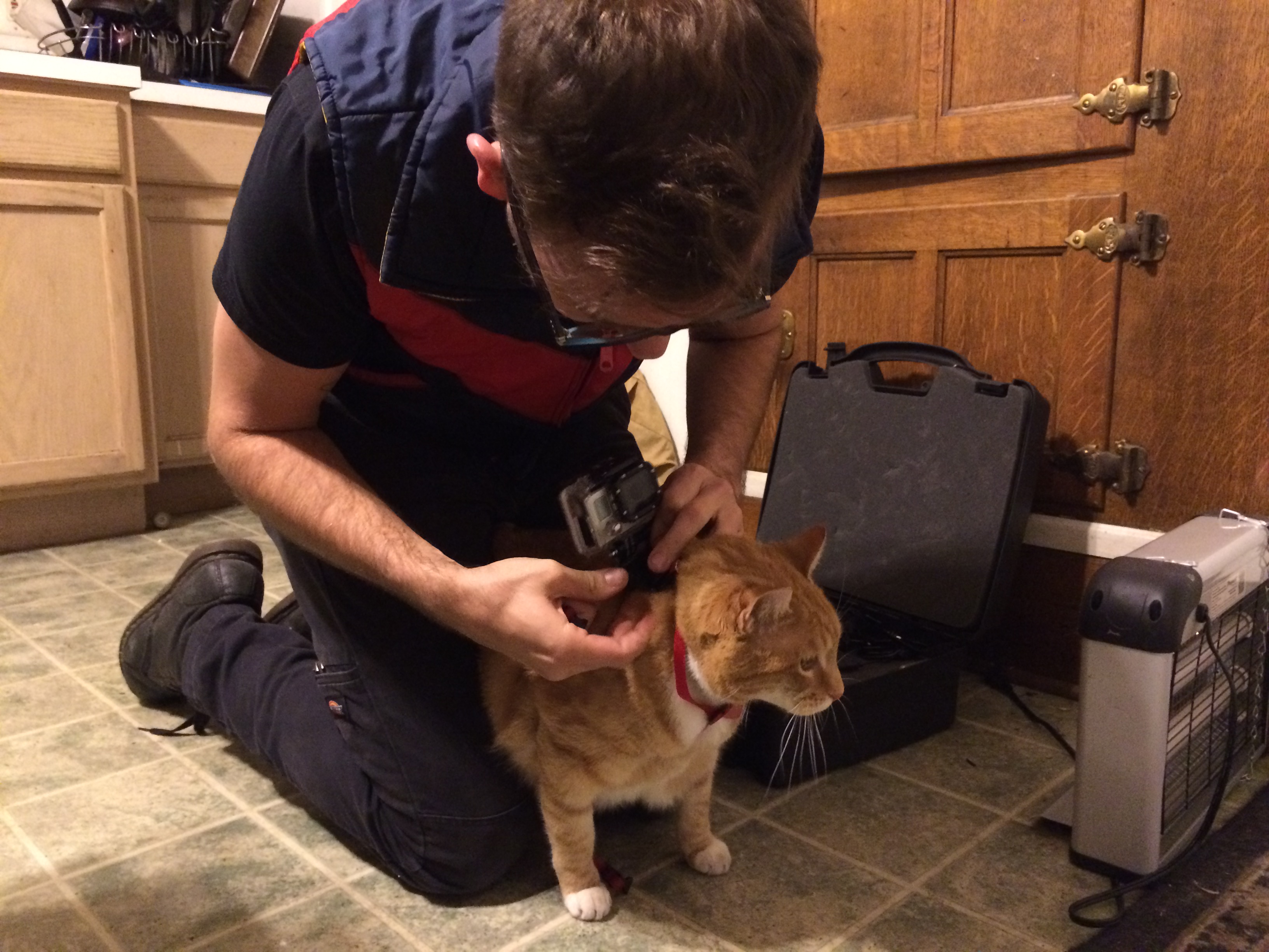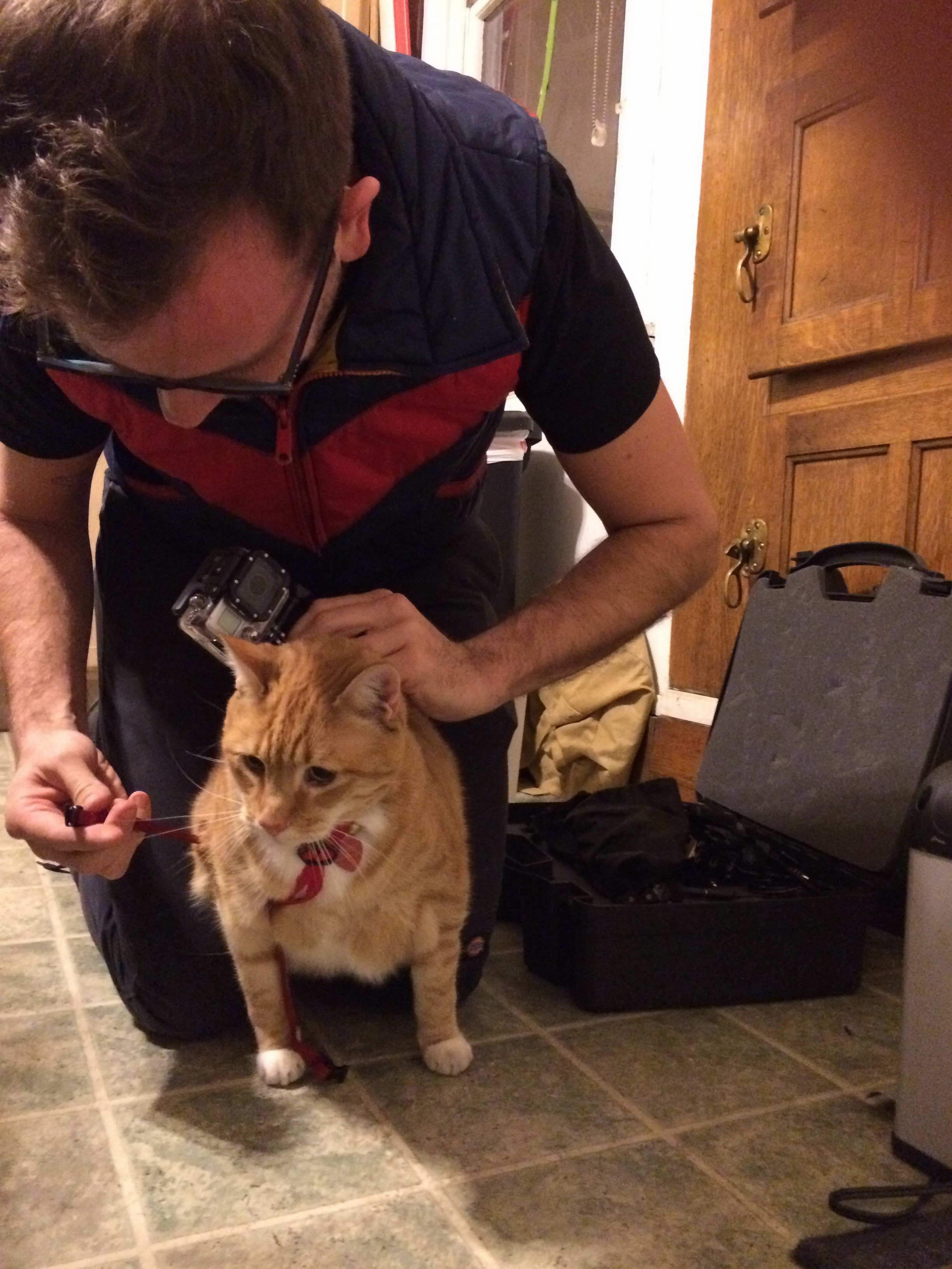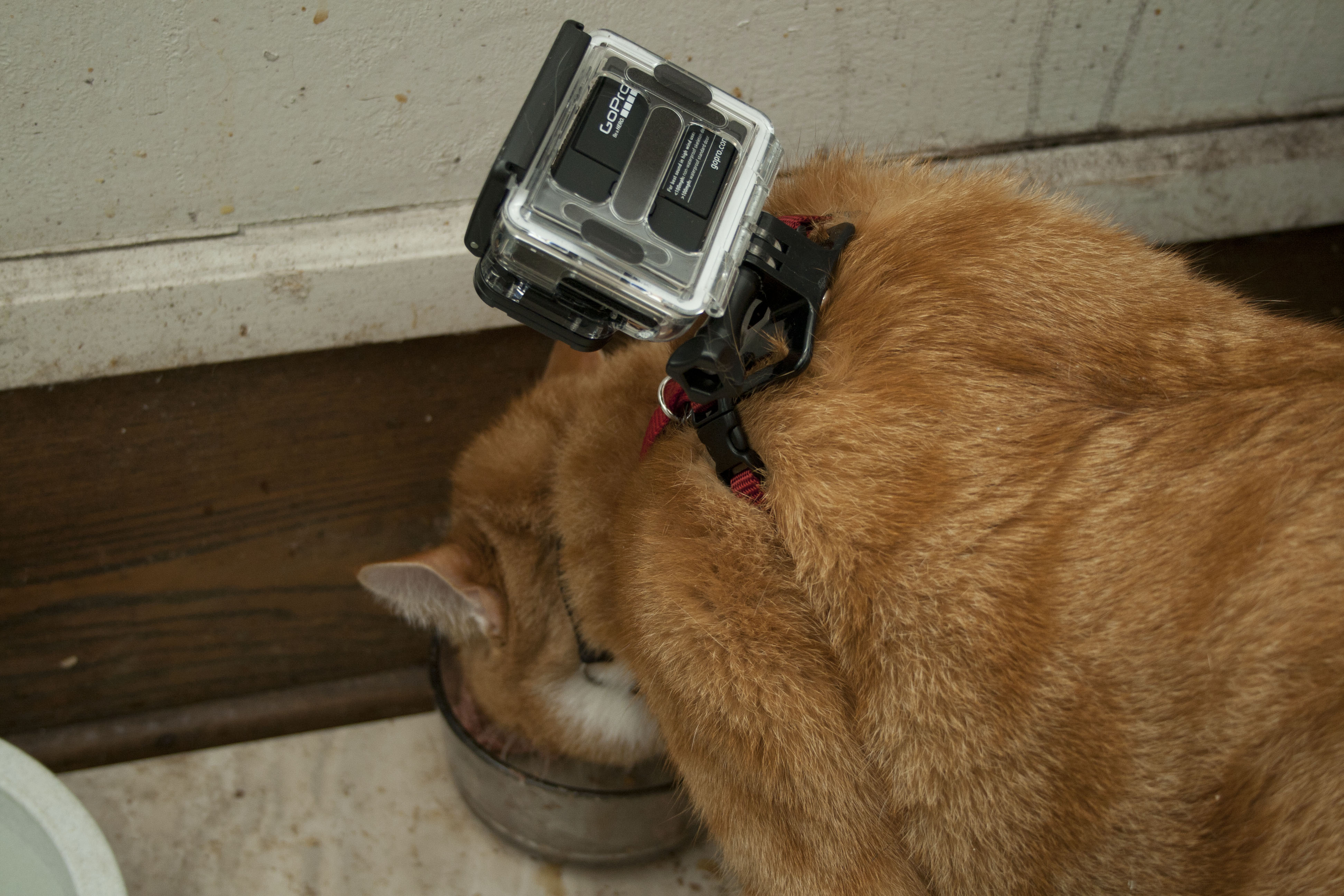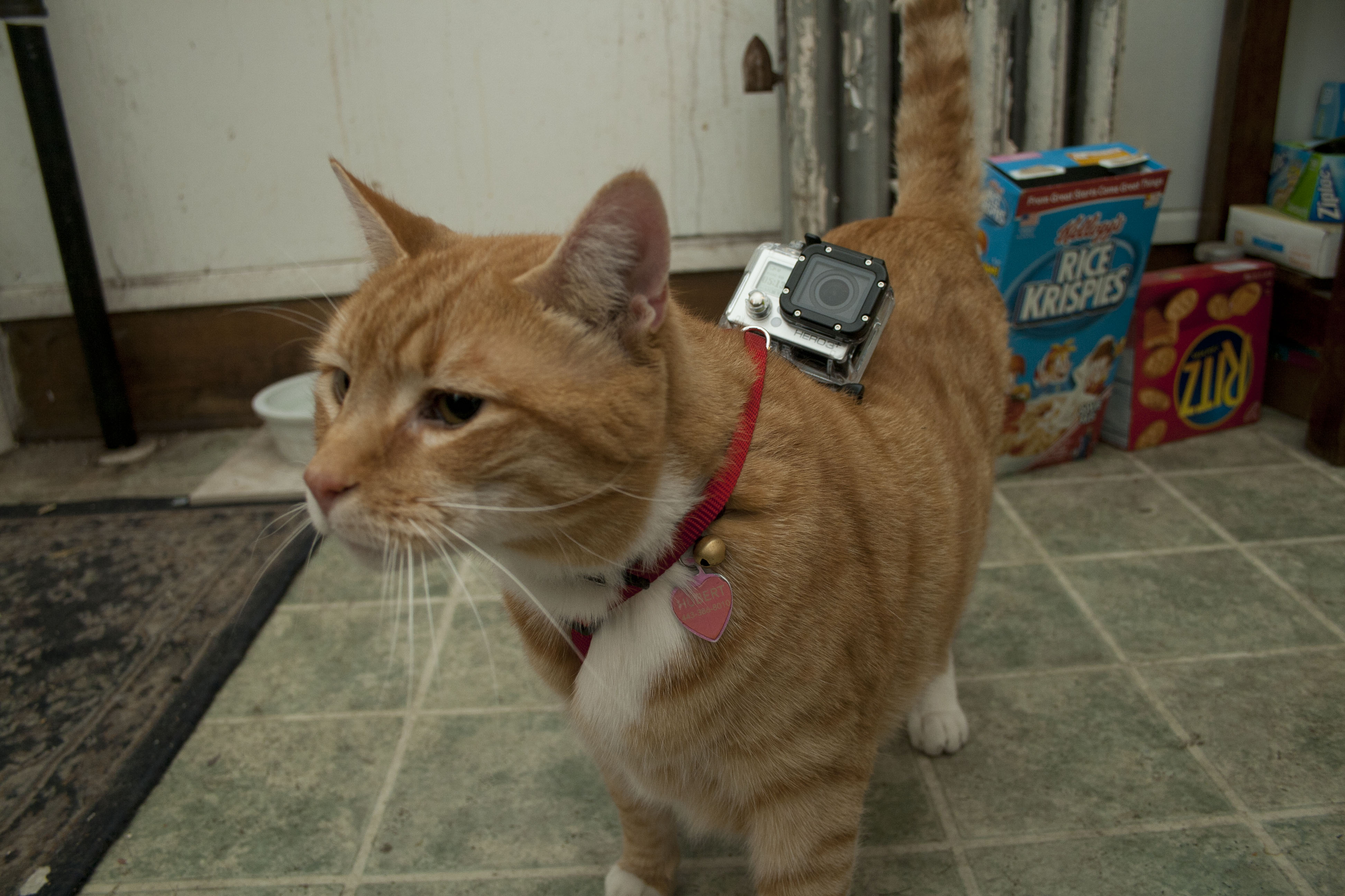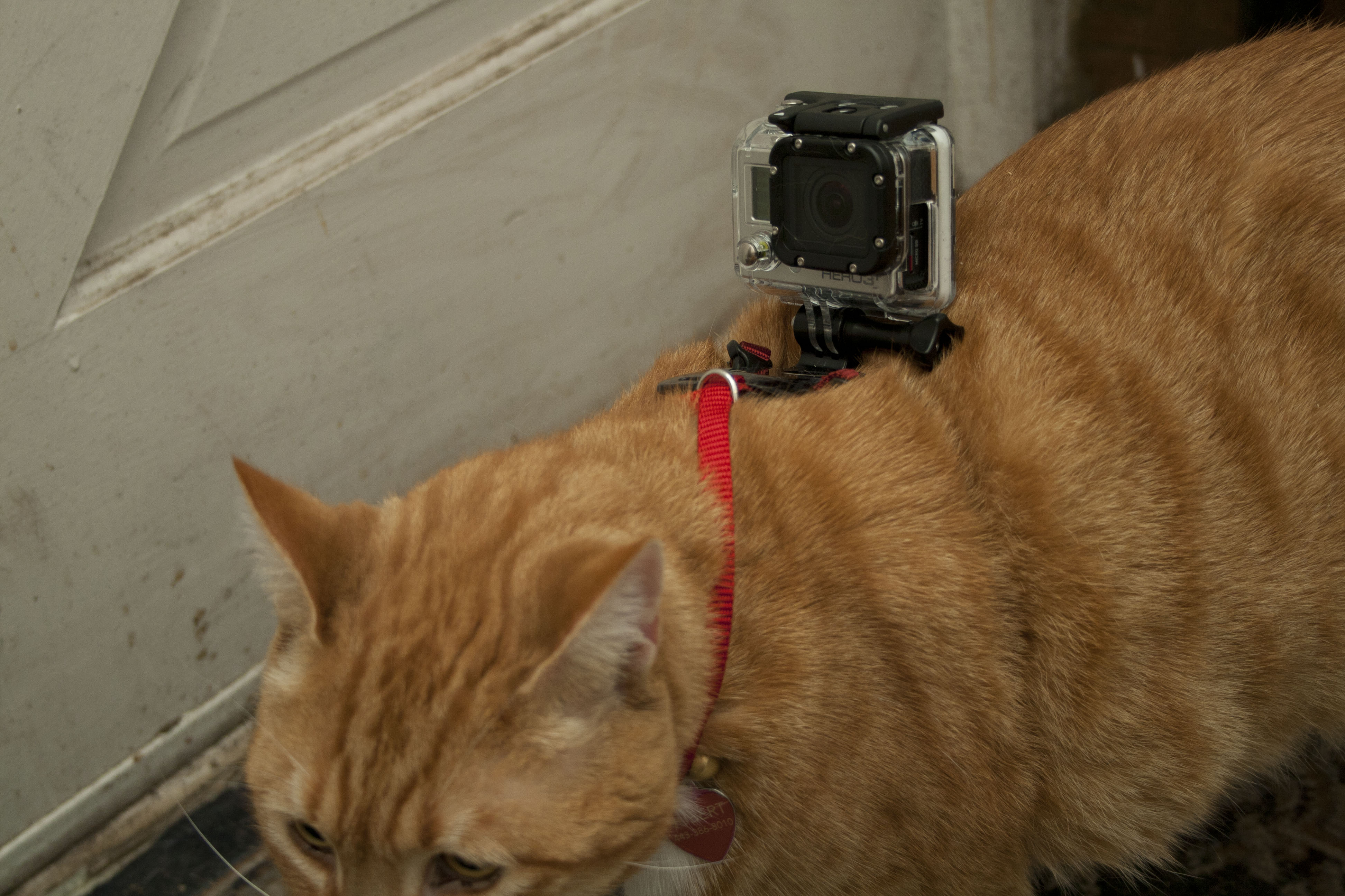 I successfully got the harness on the cat somehow. It is kinda droopy here because it was still loose. You have to tighten that up. But it turns out it’s okay if it’s a little droopy as long as it doesn’t fall side to side because the GoPro Hero 3 has a wide angle lens on it and the video from this angle looks totally amazing.