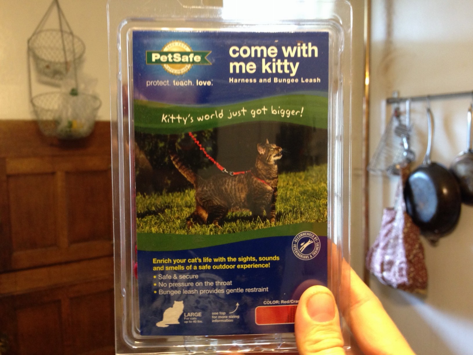 First, I bought a regular old cat harness from Howl. It’s pretty standard. I got one in large due to Jason’s considerable size. I mean, he used to be huge, but now I would just say “large,” and these don’t even come in “huge” I guess because huge cats die of diabetes pretty quick.